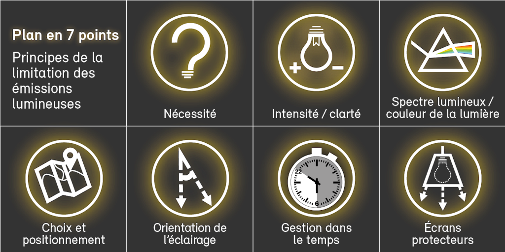 Qu’il s’agisse de l’éclairage de routes, d’installations sportives ou de bâtiments historiques, il est important de trouver le bon équilibre entre la nécessité d’éclairer et la protection de l’environnement. Dans la plupart des cas, cet équilibre peut être atteint en combinant plusieurs mesures : limiter l’éclairage au strict nécessaire (aussi pour des raisons d’économie d’énergie), fixer des heures d’exploitation contraignantes ou orienter la lumière de manière encore plus précise.
