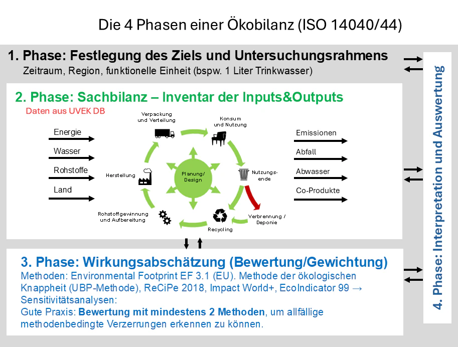Eine Ökobilanz betrachtet den gesamten Lebensweg eines Produkts von der Rohstoffgewinnung und der Herstellung über den Transport und die Nutzung bis zur Entsorgung bzw. zur Verwertung. ISO 14'040 gliedert die Ökobilanzierung in vier Phasen.