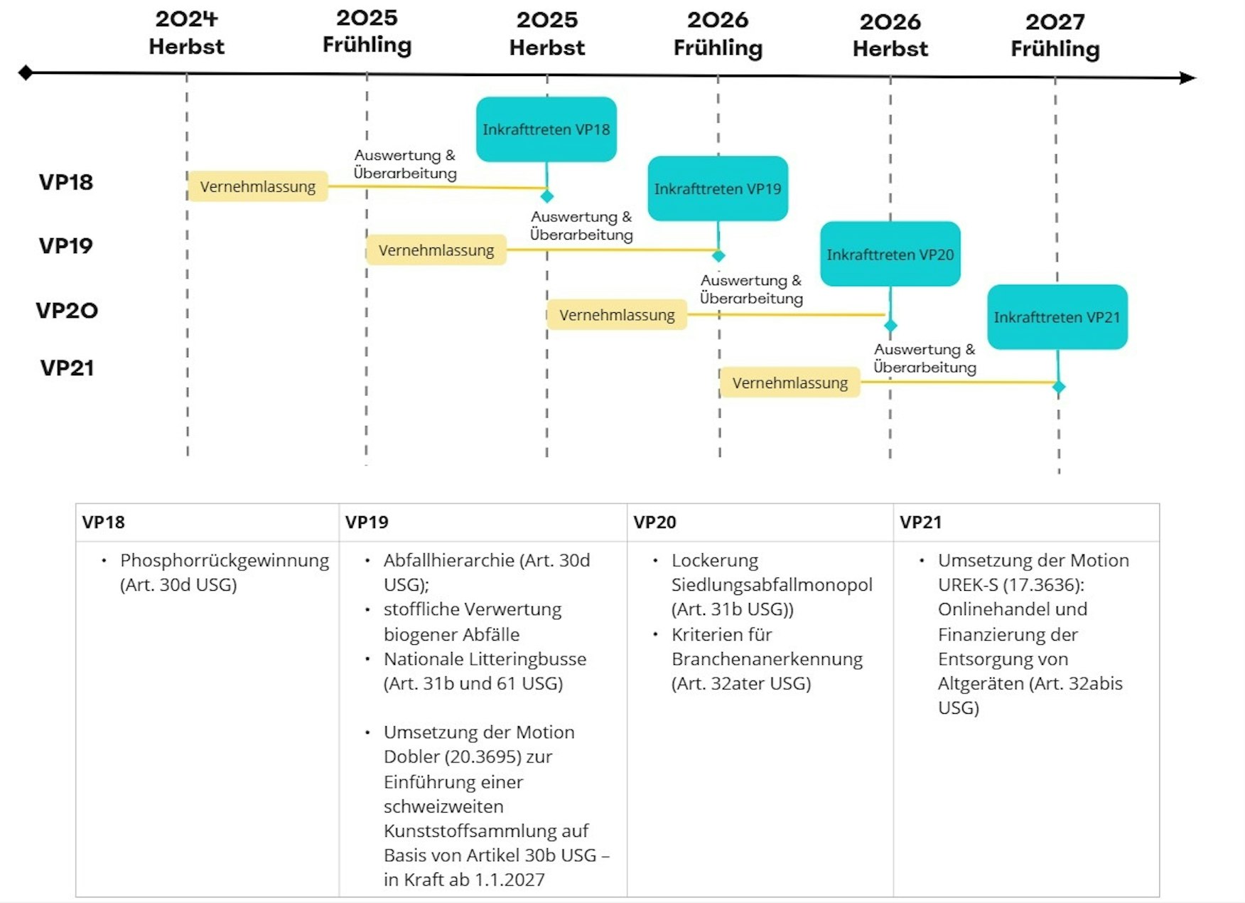 Der Bundesrat hat am 13. November 2024 entschieden, die neuen Rechtsgrundlagen grösstenteils per 1. Januar 2025 in Kraft zu setzen. Später in Kraft treten werden die Bestimmungen zum Littering (Art. 31b Abs. 7 & Art. 61 Abs. 4), die Bestimmungen zum Siedlungsabfallmonopol (Art. 31b Abs. 4-6 USG) und zur Finanzierung über private Branchenorganisationen (Art. 32ater USG). Die genannten Bestimmungen treten erst später, zusammen mit den dazugehörigen Konkretisierungen auf Verordnungsstufe, in Kraft. Die entsprechenden Verordnungsrevisionen werden gestaffelt in die Vernehmlassung geschickt werden. Für die Einführung der nationalen Litteringbusse ist die Vernehmlassung für Mitte 2025 geplant. Die Vernehmlassung zu den Bestimmungen betreffend das Siedlungsabfallmonopol sowie zur Finanzierung über private Branchenorganisationen ist Ende 2025 geplant. Die Umsetzung der Motion Dobler 20.3695 und die Einführung einer schweizweit einheitlichen Sammlung von Kunststoffen ist auf Basis des bestehenden Artikels 30b des Umweltschutzgesetzes geplant. Die Vernehmlassung über die entsprechende Verordnungsrevision ist für das erste Halbjahr 2025 vorgesehen.