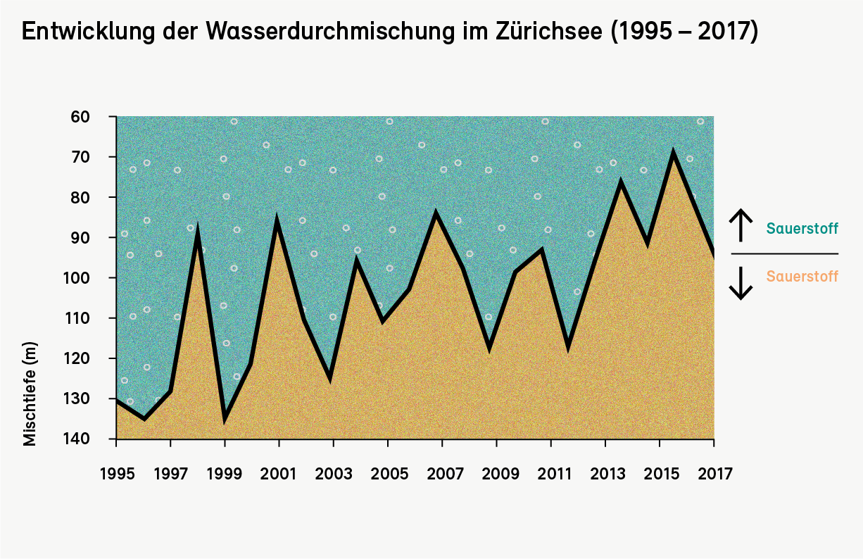 Die in den vergangenen Jahrzehnten beobachtete Erwärmung des Wassers wirkt sich negativ auf die Durchmischung der Seen aus. Kühlt das Oberflächenwasser in einem milden Winter nicht genügend ab, kann sich die warme Oberfläche aus rein physikalischen Gründen kaum mehr mit dem kalten Tiefenwasser austauschen. Die Erwärmung der Seen verläuft parallel zum Anstieg der Lufttemperaturen. Die deutlichste Veränderung zeigt sich im Herbst. Die Wassertemperatur an der Oberfläche des Zürichsees etwa hat im Oktober pro Jahrzehnt durchschnittlich um 0.5°C zugenommen. Für die 80 Jahre, seit denen solche Messungen durchgeführt werden, bedeutet das einen Anstieg von 4°C.