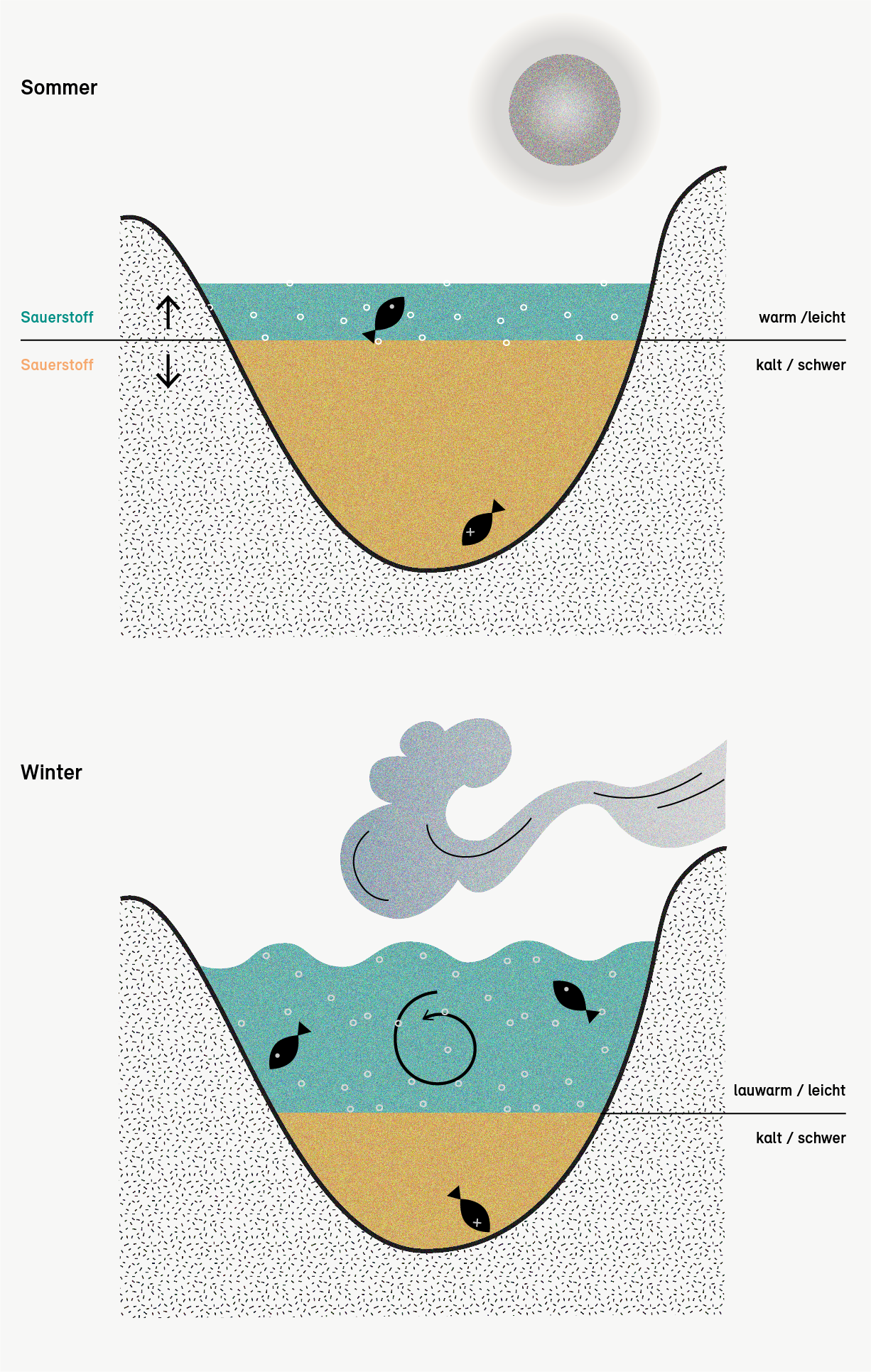 Der Mechanismus, durch den sauerstoffreiches Oberflächenwasser in die Tiefe gelangt und sauerstoffarmes Tiefenwasser an die Oberfläche transportiert wird, funktioniert so: Wasser ist bei 4°C am schwersten. Deshalb verharrt die Wassertemperatur in der Tiefe das ganze Jahr über konstant bei dieser Temperatur. Wenn im Winter auch das Wasser an der Oberfläche gegen 4°C abkühlt, verschwinden die Temperaturunterschiede zwischen Oberflächen- und Tiefenwasser. Wehen nun noch genug starke Winde, kommt es zu einer tief reichenden vertikalen Durchmischung der Wasserschichten.