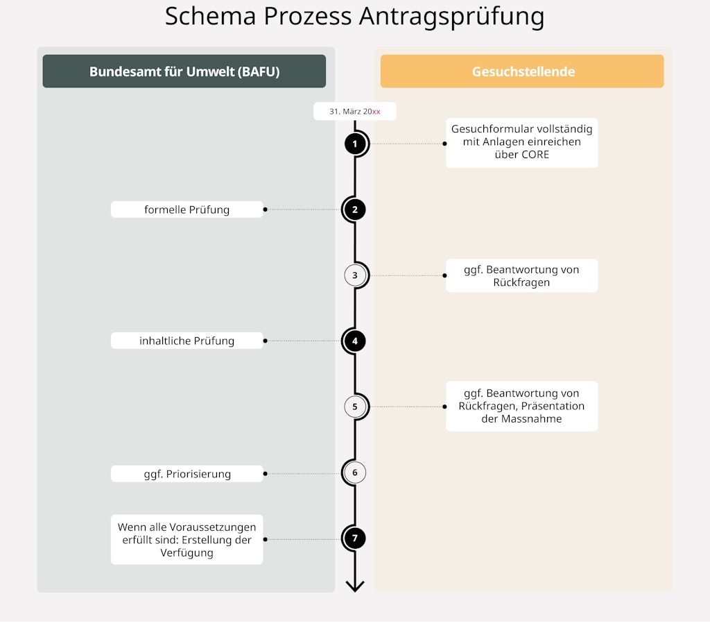 Erfüllt eine Massnahme nicht die erforderlichen Voraussetzungen, oder erreicht sie im Rahmen der Priorisierungsbewertung einen niedrigeren Rang, wird der Prüfprozess an der betreffenden Stelle beendet und nicht auf das Gesuch eingetreten.