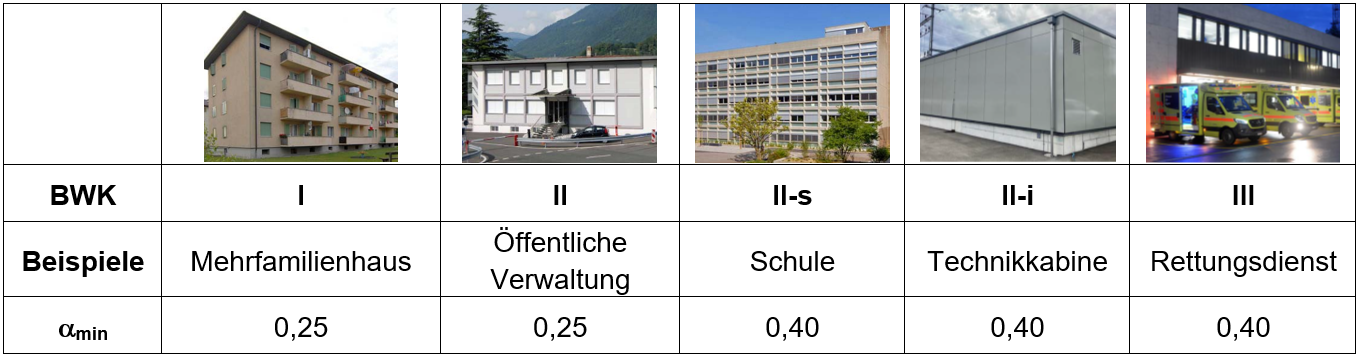 Eine fachgerechte Überprüfung gemäss Norm SIA 269/8 untersucht Mängel in der konzeptionellen Gestaltung und konstruktiven Durchbildung der Bauten und bestimmt den sogenannte Erfüllungsfaktor αeff als Ergebnis der rechnerischen Beurteilung. Der Erfüllungsfaktor beschreibt, inwieweit die Anforderungen an die Erdbebensicherheit gemäss den gültigen Tragwerksnormen bei der überprüften Baute erfüllt sind. Entsprechend der Bedeutung und Nutzung der Baute - abhängig von der sogenannten Bauwerksklasse (BWK) - legt die Norm Mindestanforderungen (αmin) fest.