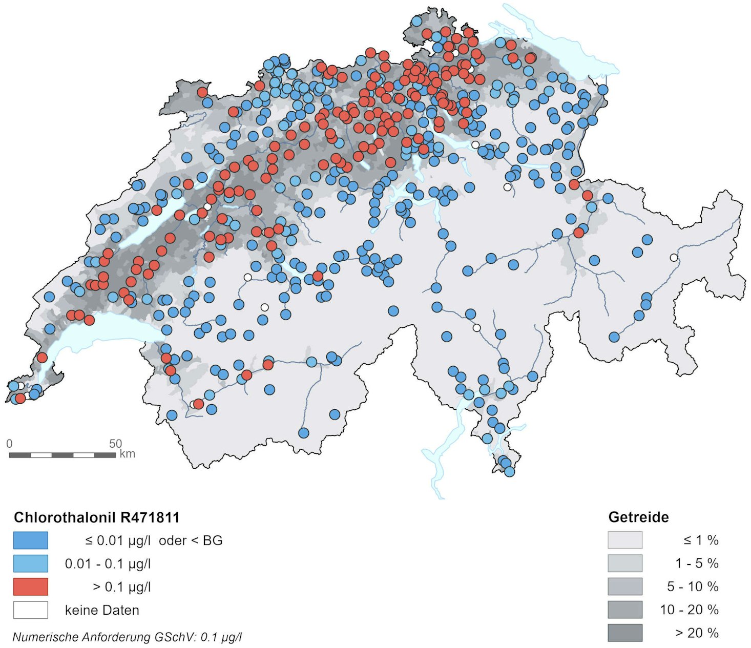 Besonders stark ist das Grundwasser durch den Metabolit Chlorothalonil R471811 belastet. Er überschreitet im Mittelland an mehr als 60% der Messstellen den Wert von 0.1 Mikrogramm pro Liter. Landesweit ist jede dritte Messstelle betroffen.