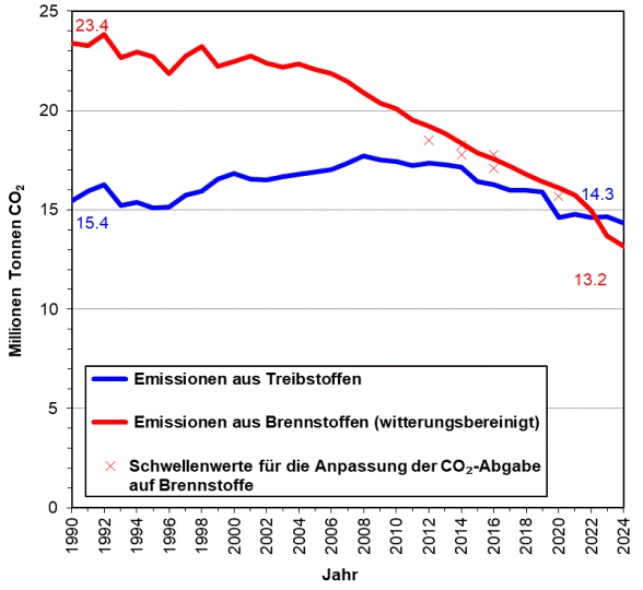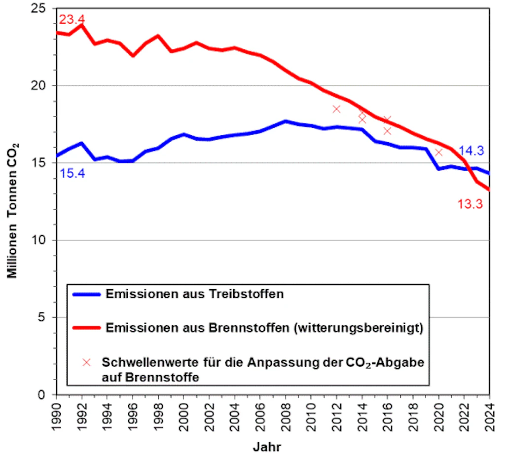 Für die CO2-Abgabe sind nur CO2-Emissionen aus Brennstoffen relevant. Da der Heizenergieverbrauch stark von der Witterung abhängig ist, werden die CO2-Emissionen aus Brennstoffen vor dem Vergleich mit den Schwellenwerten witterungsbereinigt. Die angewandte Witterungsbereinigung berücksichtigt die Aussentemperatur und die Sonneneinstrahlung. Für die Beurteilung der Erreichung der Reduktionsziele werden die Emissionen nicht witterungsbereinigt.