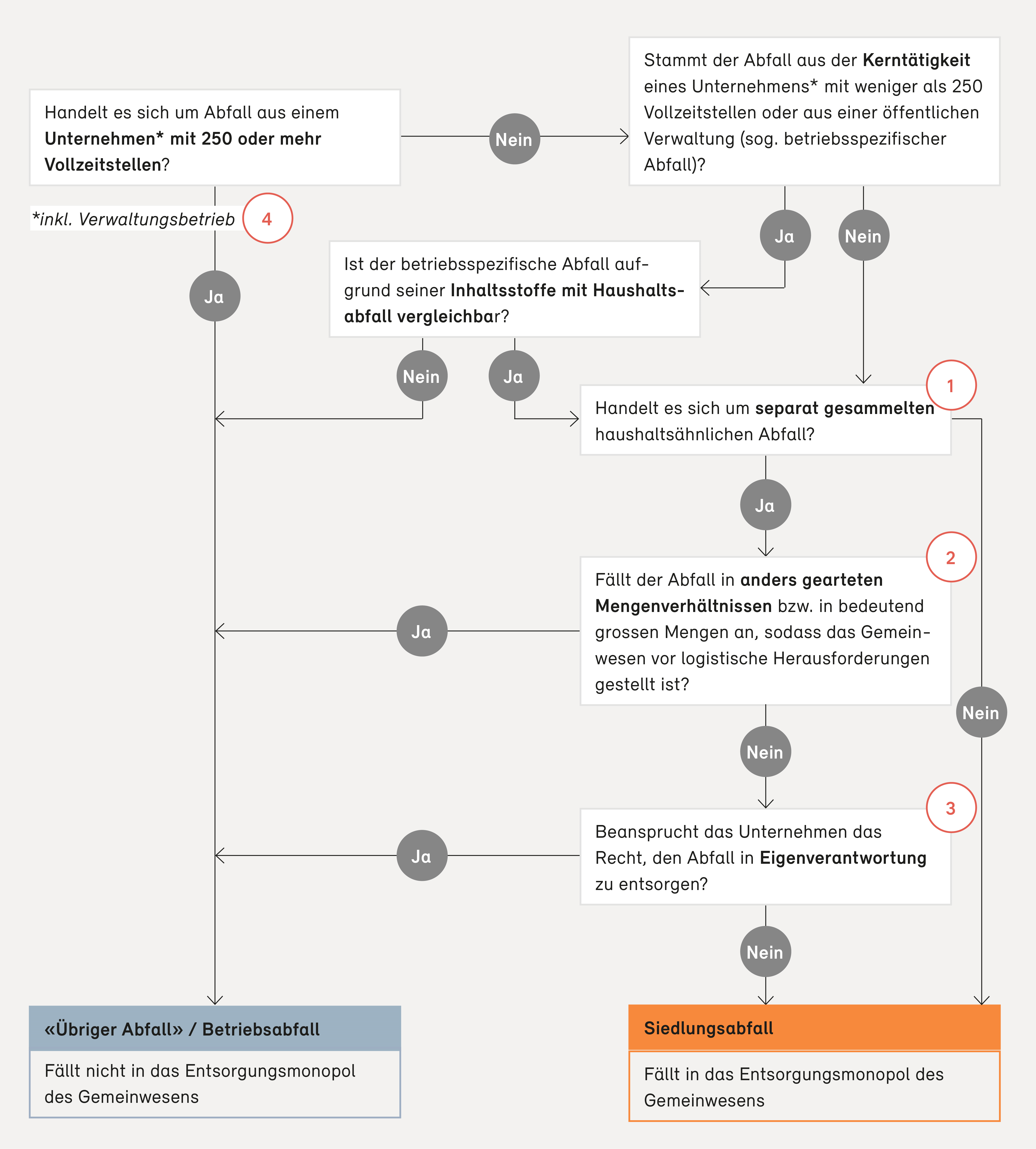 Die nachfolgende Abbildung zeigt auf, welche Abfälle aus Unternehmen (inkl. Verwaltungsbetrieben) und öffentlichen Verwaltungen im Sinne von Art. 3 Bst. a VVEA und der bestehenden Rechtsprechung als Siedlungsabfälle und welche als «übrige Abfälle» einzustufen sind. Der Entscheidungsbaum dient als Hilfestellung bei der Beurteilung einer einzelnen Abfallfraktion (z. B. Papier). Andere Abfälle desselben Unternehmens bzw. derselben öffentlichen Verwaltung können durchaus weiterhin in das Entsorgungsmonopol des Gemeinwesens fallen (z. B. Kehricht).