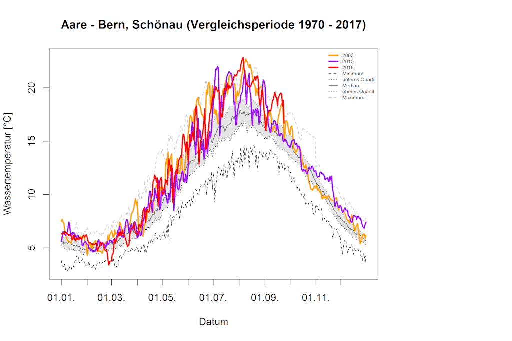 Die geringe Wasserführung in Kombination mit der immer noch starken Sonneneinstrahlung und den hohen Lufttemperaturen hat die Wassertemperatur in vielen Flüssen des Schweizer Mittellands seit anfangs September wieder ansteigen lassen. Deshalb sind die Wassertemperaturen der Flüsse weiterhin noch stark erhöht. Sie erreichen aber – saisonbedingt - nicht mehr die kritisch hohen Werte, die für Wasserlebewesen gefährlich werden können. So werden an einigen Flüssen für die zweite Septemberhälfte neue Maxima gemessen. An der Aare in Bern liegt die Wassertemperatur immer noch bei rund 20 Grad, an der Rhone in Genf bei 22 Grad oder bei der Tresa (Seeausfluss aus dem Lago di Lugano) bei 24 Grad.