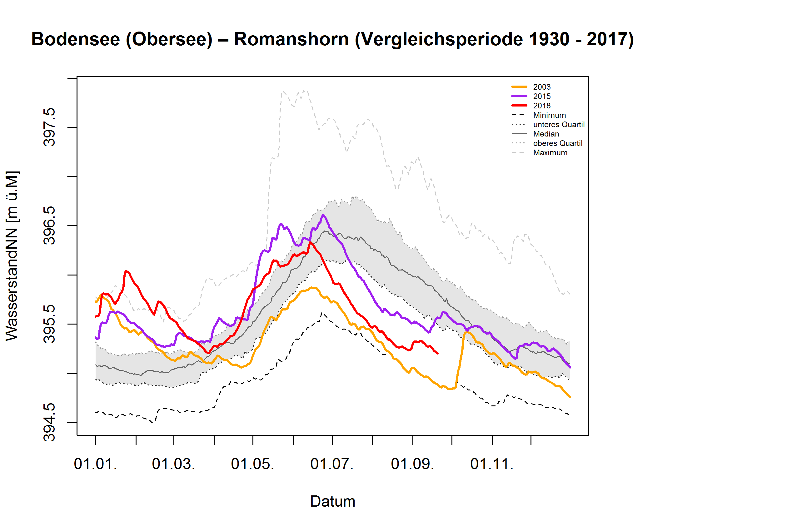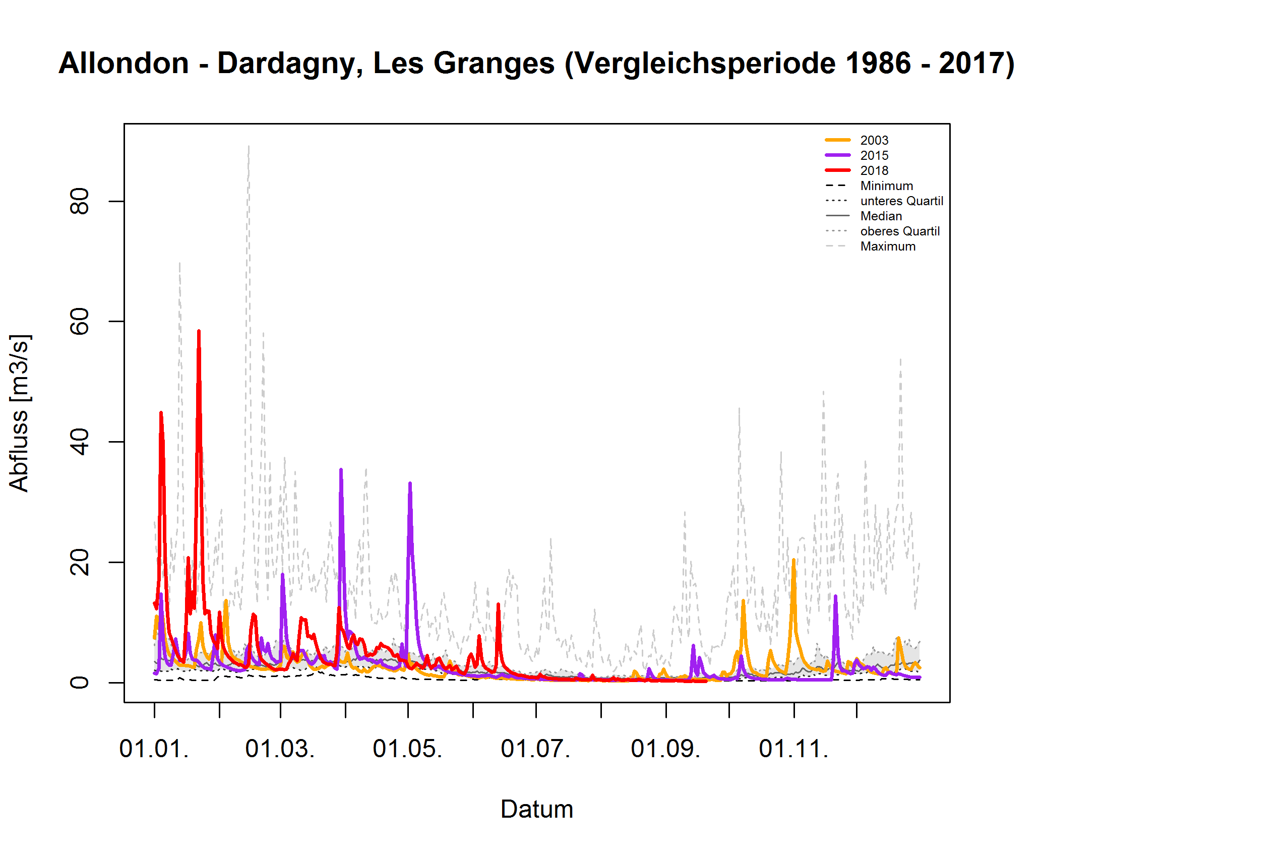 Reiht man die bis Mitte September beobachteten Messwerte in die Niedrigwasserstatistik ein, so werden an vielen Flüssen des westlichen und zentralen Mittellands sowie des Juras Abflussmengen gemessen, wie sie nur alle zwei bis zehn Jahre auftreten. An zahlreichen Flüssen liegt die Jährlichkeit des Niedrigwassers auch deutlich höher. So zum Beispiel an der Lorze bei Zug, an der Luthern bei Nebikon oder an der Glatt bei Rheinsfelden, aber auch an der Allondon in Dardagny nahe bei Genf. Immer noch normale bis deutlich überdurchschnittliche Abflüsse verzeichneten die Flüsse in den hochalpinen vergletscherten Einzugsgebieten. Dort führte die sehr warme erste Septemberhälfte weiterhin zu starker Gletscherschmelze.