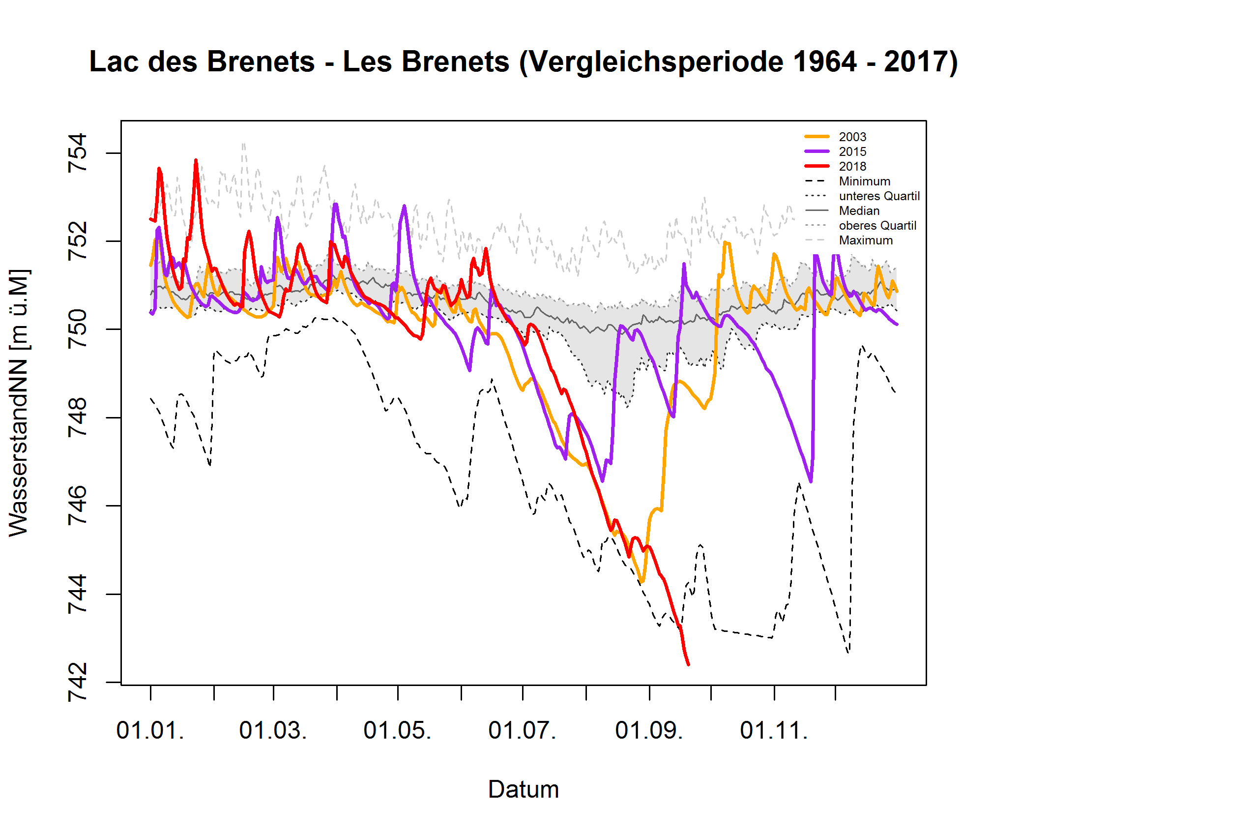 Grosse Teile des Lac des Brenets im Jura sind Mitte September trockengefallen. Die Schifffahrt musste eingestellt werden. Der Wasserstand war über mehrere Tage hinweg 16 cm pro Tag gesunken. Die Messung des niedrigen Pegels wurde an der BAFU-Messstation bei Les Brenets schwierig bis unmöglich, da die Messinstallation nicht auf ein so tiefes Niveau eingestellt ist. Ein Beispiel dafür, dass nun auch in vielen Gewässern der Westschweiz Niedrigwasser herrscht, während im Sommer noch vor allem Flüsse und Seen der Ost- und Zentralschweiz betroffen waren.