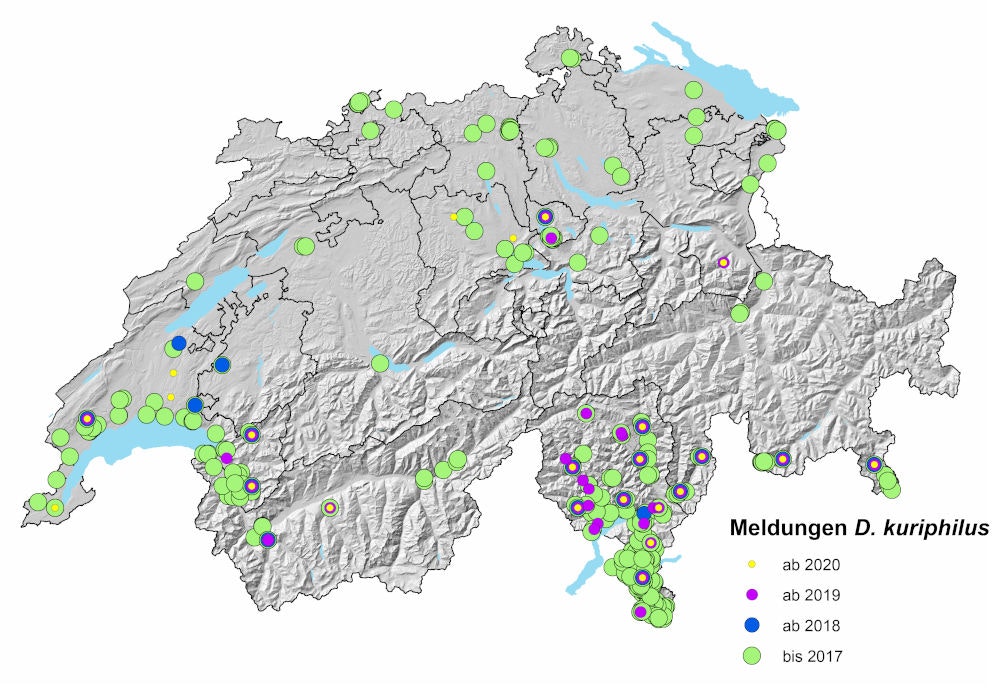Befallssituation durch die Edelkastaniengallwespe in der Schweiz: anwesend, etabliert