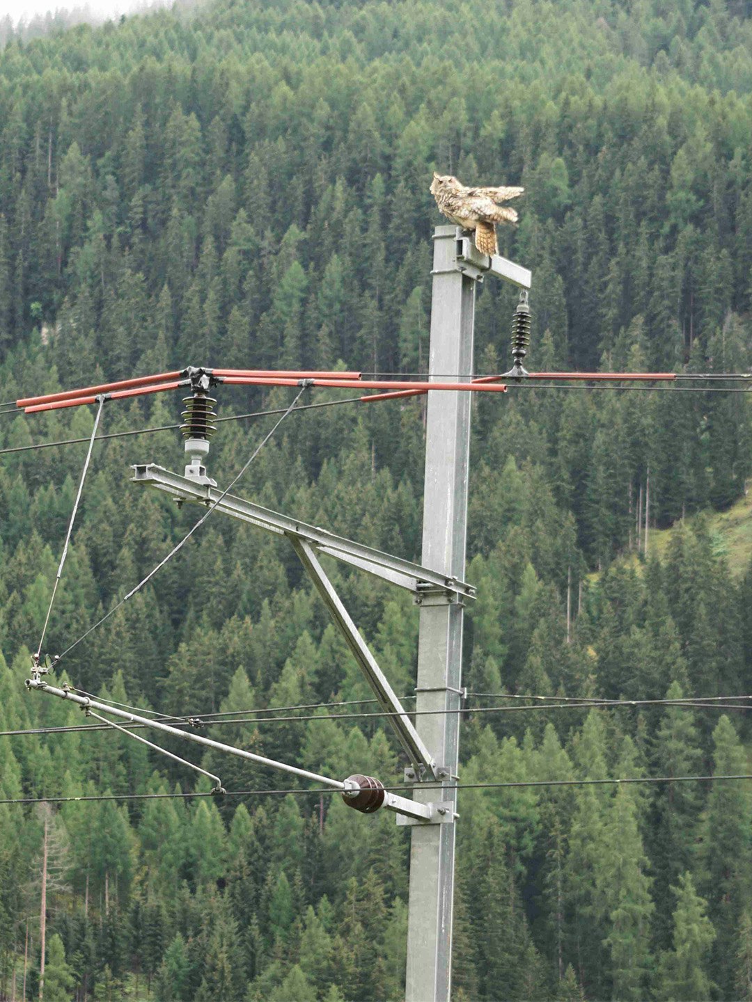 Prekär war die Lage für den Uhu unter anderem im Kanton Graubünden. In enger Zusammenarbeit mit der Schweizer Vogelwarte werden ausgehend von den Uhu-Brutplätzen die Fahrleitungsmasten der rhätischen Bahn (RhB) seit 2018 Stück für Stück vogelsicher saniert und die stromführenden Teile der Fahrleitungsmasten isoliert.