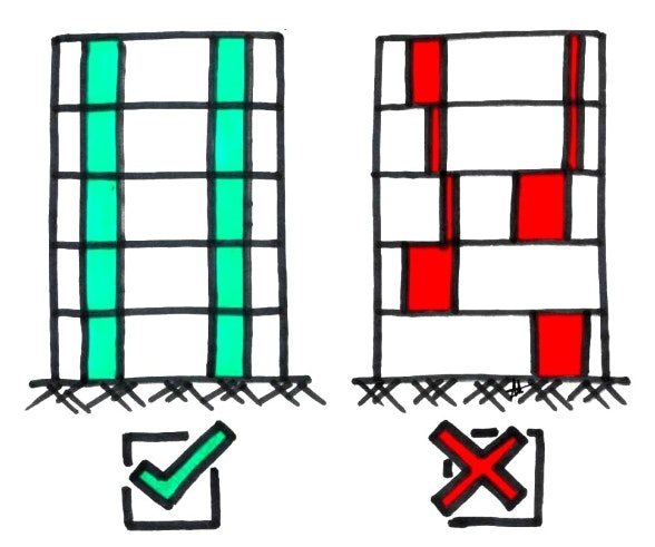 Um ein günstiges Verhalten im Erdbeben zu gewährleisten ist ein robustes Tragwerk für die Abtragung der horizontalen Erdbebenkräfte erforderlich. Aussteifende Bauteile wie Wände oder Fachwerke verlaufen kontinuierlich von der Fundation über die gesamte Höhe des Gebäudes und sind im Grundriss möglichst symmetrisch angeordnet. Die aussteifenden Bauteile sind kraftschlüssig mit den Decken verbunden. Die wichtigsten Grundsätze sind in der Publikation «Erdbebengerechter Entwurf von Hochbauten» (Grundsätze für Ingenieure, Architekten, Bauherren und Behörden, BWG 2002) beschrieben. Insbesondere bei lebenswichtigen Bauten und Anlagen wie z. B. Akutspitälern oder Feuerwehrkasernen ist ein erdbebengerechter Entwurf massgebend, um die Funktion nach einem Erdbeben sicherstellen zu können.