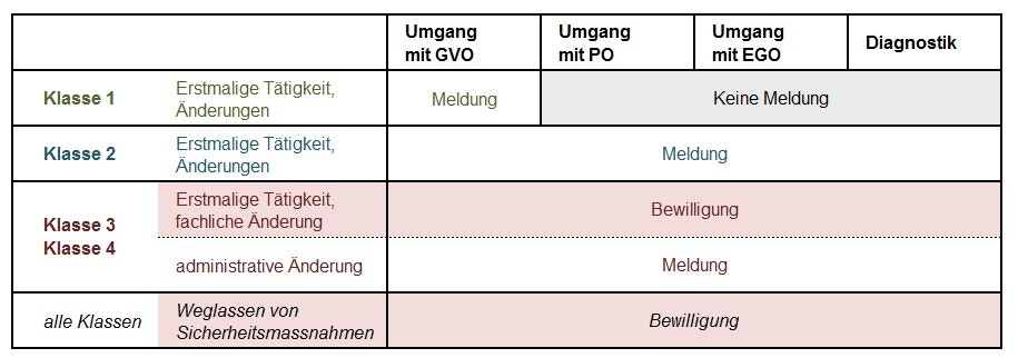 Bewilligungspflichtige Tätigkeiten (Klassen 3 und 4) und das bewilligungspflichtige Ändern, Ersetzen oder Weglassen bestimmter Sicherheitsmassnahmen dürfen erst nach Vorliegen einer Bewilligung des zuständigen Bundesamtes (Bundesamt für Umwelt BAFU oder Bundesamt für Gesundheit BAG) erfolgen.