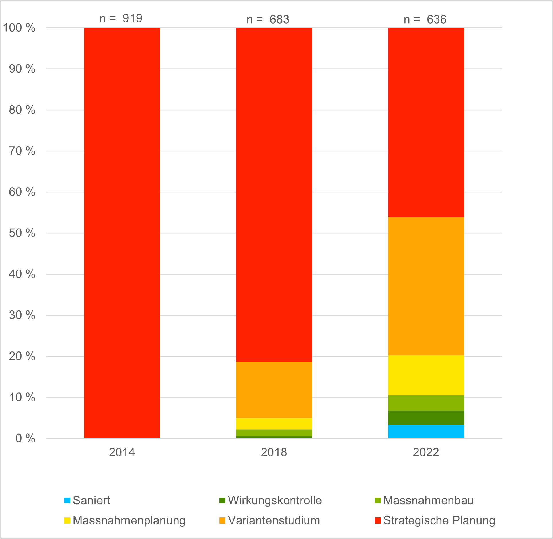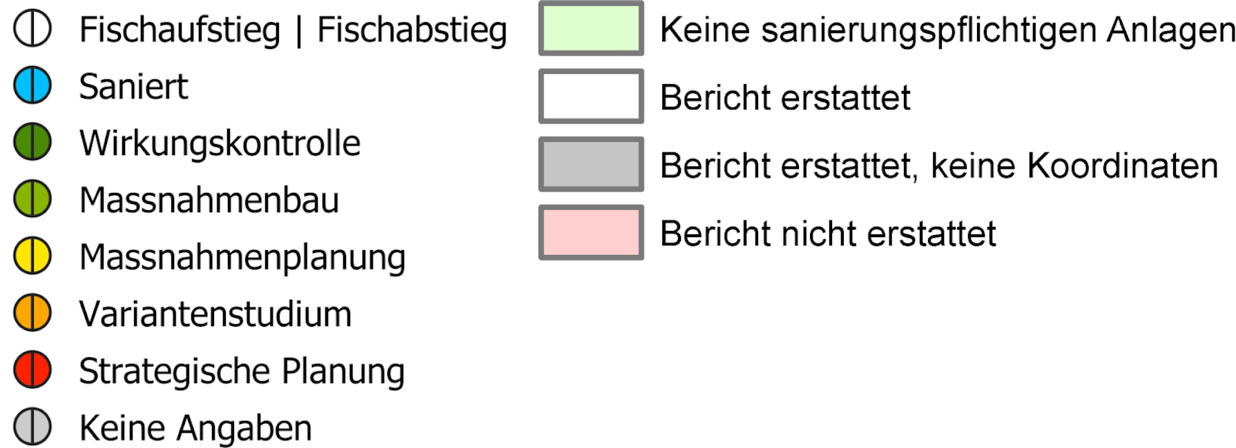Die Kantone berichten alle vier Jahre über den Umsetzungsstand der Sanierungen. In der aktuellen Berichterstattung (Stand 2022) wurden 636 Kraftwerkanlagen, bei welchen eine Sanierungsbedarf bezüglich Fischwanderung besteht, gemeldet.