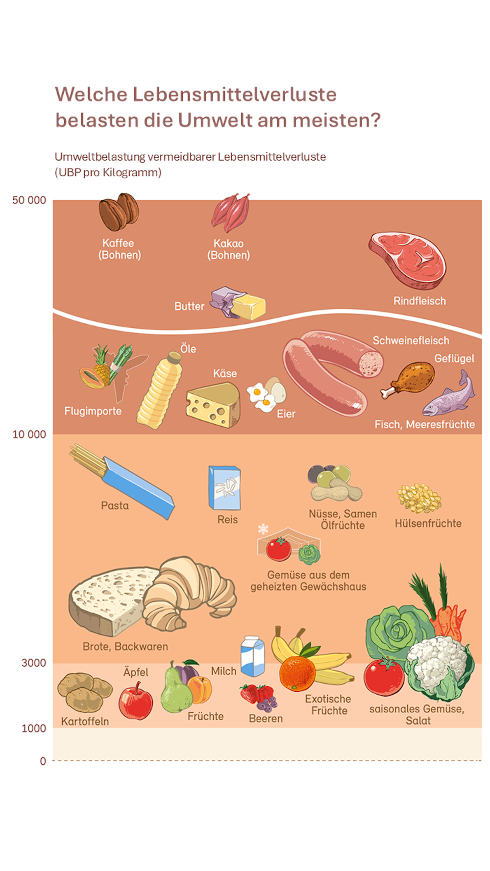 Die Umweltbelastung einer Tonne Food Waste variiert stark, je nachdem aus welchen Produkten sie sich zusammensetzt und wo in der Wertschöpfungskette sie anfällt. Lebensmittelverluste sollen prioritär bei Lebensmitteln vermieden werden, welche besonders hohe Umweltauswirkungen verursachen oder in grossen Mengen anfallen. Die Lebensmittelkategorien mit der grössten Umweltwirkung pro Kilogramm Lebensmittelverlust sind Fleisch, Kaffee- und Kakaobohnen, Butter, Eier, mit dem Flugzeug importierte Produkte sowie Öle und Fette, Fisch und Käse. Auch die Verluste von Früchten, Gemüse und Kartoffeln sowie Broten und Backwaren sind, trotz geringerer Umweltwirkung pro Kilogramm, umweltrelevant, weil sie in grossen Mengen anfallen.