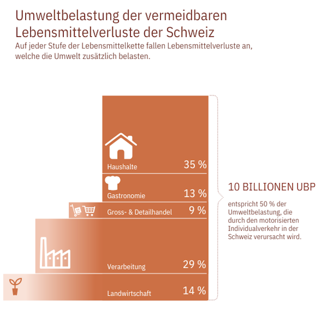 Der Anteil des Ernährungssystems am Gesamtfussabdruck der Schweiz beträgt rund 28 Prozent. Ein Viertel davon ist auf vermeidbare Lebensmittelverluste zurückzuführen. Die Umsetzung des Halbierungsziels in der Schweiz würde die Umweltbelastung und die Treibhausgasemissionen der Ernährung um 10-15 Prozent reduzieren.