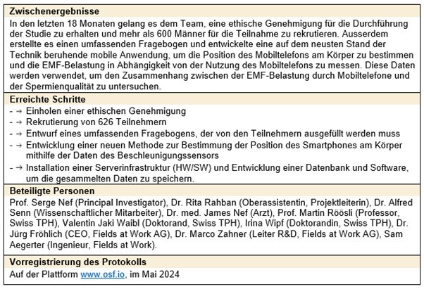 In dieser Studie werden bei 500 Männern während drei Monaten die Dauer und die Art der Nutzung sowie die Position des Mobiltelefons anhand einer App aufgezeichnet. Gleichzeitig werden Spermienproben erhoben und verschiedene Blutparameter laborchemisch untersucht. Im Unterschied zu bisherigen rückblickenden Studien, bei welchen die Abschätzung der Exposition auf der selbstberichteten Mobiltelefonnutzung in der Vergangenheit basiert, hat diese Art der Forschung den entscheidenden Vorteil, genaue Daten zur Nutzung und somit auch zur Exposition zu verwenden.