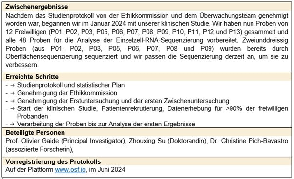 Am 7. Juni 2024 fand ein Symposium im Rahmen dieses Forschungsprogramms statt. Diese Veranstaltung, die sich in erster Linie an die wissenschaftliche und medizinische Gemeinschaft sowie an die Bundesverwaltung richtete, diente der Bestandsaufnahme der verschiedenen laufenden Projekte sowie dem Austausch und der wissenschaftlichen Diskussion der Thematik. Das Programm des Symposiums und die Zusammenfassungen über den Stand der Forschungsprojekte finden sich in folgendem Dokument: