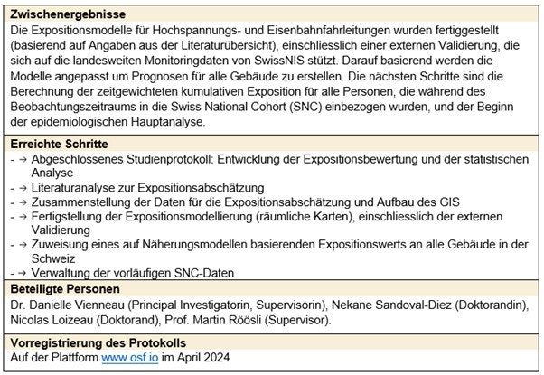 Die Exposition gegenüber hochfrequenten elektromagnetischen Feldern (HF-EMF) durch Mobilfunkbasisstationen und Radiosender ist unfreiwillig und ein Teil der Bevölkerung ist besorgt wegen möglichen Gesundheitsrisiken durch diese sogenannten Fernfeldquellen. Insbesondere werden unspezifische Gesundheitssymptome im Zusammenhang mit diesen HF-EMF-Quellen genannt. Ziel des vorliegenden Projektes ist i) mittels Modellierung und persönlicher Messungen ein besseres Verständnis zur HF-EMF Exposition durch Mobilfunkbasisstationen und Rundfunksender zu erhalten und ii) die Untersuchung der Auswirkungen von Immissionen von Mobilfunkbasisstationen sowie Rundfunksendern auf die kognitiven Fähigkeiten, unspezifische Symptome inklusive Schlafqualität und das Verhalten von Jugendlichen. Es ist geplant eine prospektive Kohortenstudie bei rund 800 Jugendlichen aus der Zentralschweiz und beider Basel mit einem Jahr Follow-up Periode durchzuführen. Zusätzlich wird bei 150 Jugendlichen der Kohortenstudie eine eingebettete Panelstudie durchgeführt, bei welcher das Bewegungs- und Schlafverhalten mittels Aktimetern während einer Woche und die persönliche HF-EMF Exposimeter mittels Expom-RF während drei Tagen gemessen wird. Die Expositionserhebung beinhaltet drei Komponenten:
