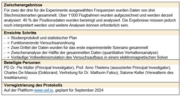 Diese Studie untersucht anhand von Videoaufzeichnungen das Flugverhalten von Stechmücken, wenn sie auf dem Weg zu ihrer Beute hochfrequenter Strahlung verschiedener Frequenzen ausgesetzt werden.