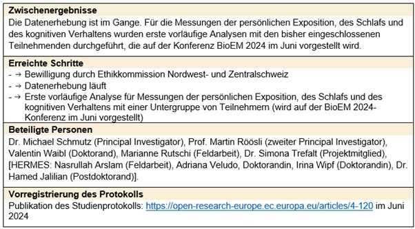 3. Persönliche Messungen werden bei einer Subgruppe während drei Tagen durchgeführt. Diese Expositionsdaten werden einerseits benutzt, um die Qualität der HF-EMF Modellierung zu evaluieren, andererseits werden sie für Dosisabschätzungen verwendet, welche in die epidemiologischen Analysen einfliessen werden. Die Erhebung der gesundheitlichen Effekte beinhaltet die Erhebung von nichtspezifischen Symptomen (z.B. Schlafqualität, Kopfschmerzen) mittels Fragebogen, objektive Schlafqualität mittels Aktimeter (GENEActiv), Verhaltensprobleme (Strengths and Difficulties Questionnaire, SDQ) und kognitive Funktionen mit einer standardisierten Testbatterie (Cambridge Brain Sciences). In der prospektiven statistischen Analyse wird untersucht, ob die Fernfeld-HF-EMF-Exposition einen Einfluss auf die Veränderung der oben beschriebenen Endpunkte innerhalb eines Jahres unter Berücksichtigung von möglichen Störgrössen (Confounder) und der Exposition von Nahfeldquellen hat. Dies wird weltweit die erste Studie sein, welche den Zusammenhang zwischen unspezifischen Symptomen inkl. Schlaf, Verhalten und kognitive Fähigkeiten im Zusammenhang mit HF-EMF von Fernfelder untersucht und dabei für die HF-EMF Exposition von Nahfeldquellen korrigiert. Die HF-EMF Exposition durch Fernfeldquellen ist in der Nacht dominierend und deshalb möglicherweise für die Schlafqualität am relevantesten. Zudem wird die Studie eine Vielzahl von HF-EMF Expositionsdaten liefern, welche für zukünftige Studien und die Risikokommunikation hilfreich sind. Durch die Einbettung dieser Studie in die laufende europäische GOLIAT-Kohorte ergeben sich zahlreiche Synergieeffekte und Kosteneinsparungen. Im Rahmen der EU-Studie GOLIAT ist die Datenerhebung in HERMES 3 weitgehend finanziert, jedoch sind keine HF-EMF Modellierung von Fernfeldquellen und keine persönlichen HF-EMF Messung geplant.