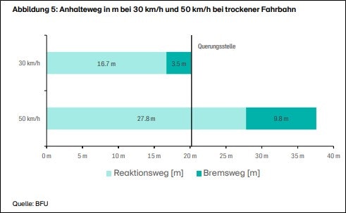 - Bei 30 km/h bleibt der Verkehr flüssig, da weniger gebremst und beschleunigt wird. Der Verkehrsfluss wird gleichmässiger. Zudem verhalten sich alle Verkehrsteilnehmende vorsichtiger und verständigen sich besser.