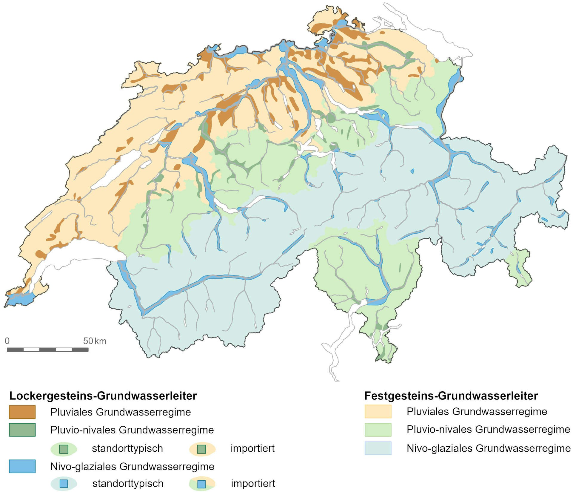 Das nivo-glaziale Grundwasserregime ist standorttypisch für den Alpenraum. Da die Winterniederschläge hier grösstenteils als Schnee fallen und somit nicht unmittelbar zur Grundwasserneubildung beitragen, weisen die Grundwasserstände und Quellabflüsse in diesen Gebieten ein Minimum zwischen Dezember und Februar auf. Das Maximum erfolgt zwischen Mai und Juli im Zuge der Schnee- und Gletscherschmelze.
