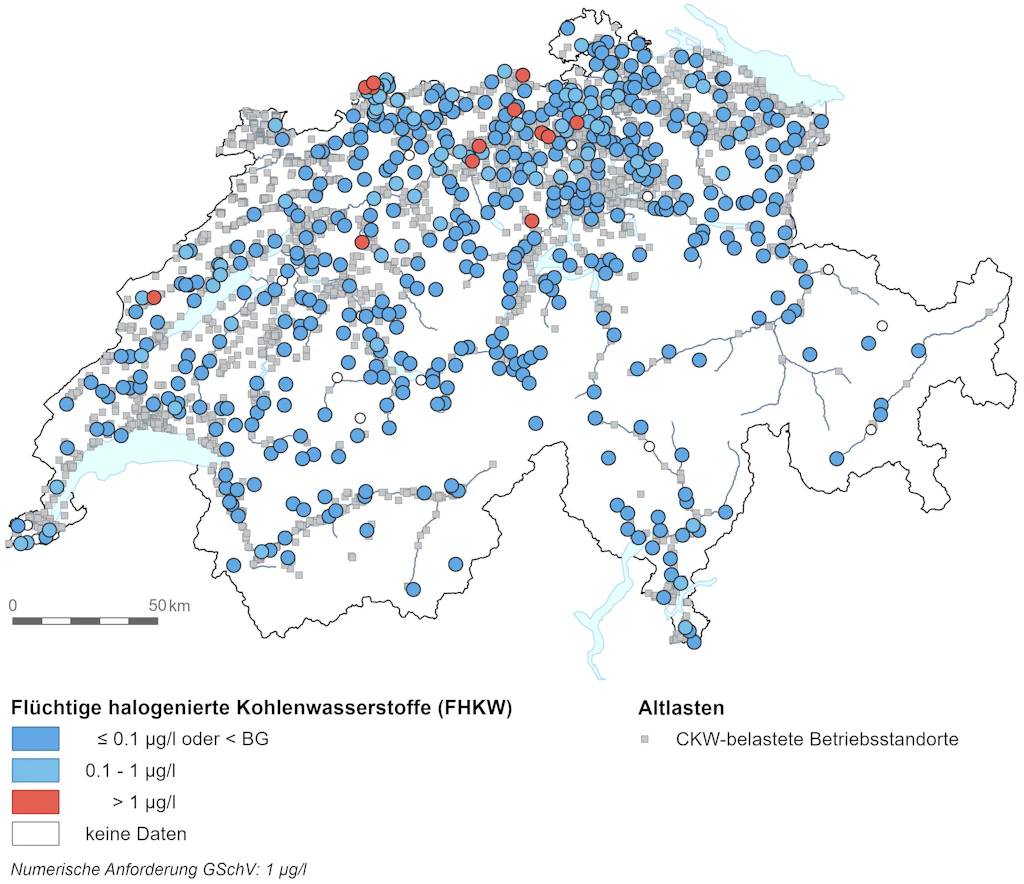 Gemäss der Gewässerschutzverordnung (GSchV) soll Grundwasser generell keine künstlichen langlebigen Substanzen enthalten. Für Grundwasser, das als Trinkwasser genutzt wird oder dafür vorgesehen ist, gilt für flüchtige halogenierte Kohlenwasserstoffe (FHKW) und monozyklische aromatische Kohlenwasserstoffe (MAKW) zudem ein Grenzwert («numerische Anforderung») von 1 Mikrogramm pro Liter (µg/l) und für polyzyklische aromatische Kohlenwasserstoffe (PAK) von 0.1 µg/l.