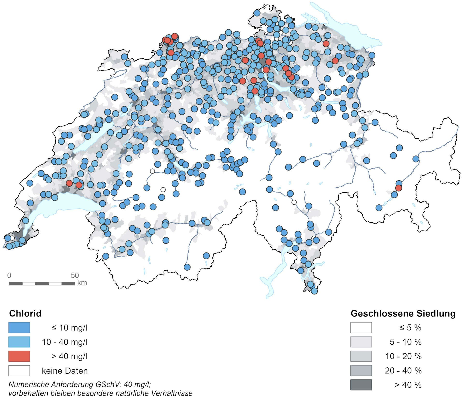 Natürlicherweise ist Chlorid in der Schweiz nur in geringen Mengen im oberflächennahen Grundwasser vorhanden. Konzentrationen über 40 mg/l im Grundwasser treten ausschliesslich an Messstellen in Strassennähe oder im Siedlungsgebiet auf. Diese sind in erster Linie auf die Versickerung von mit Streusalz belastetem Strassenabwasser zurückzuführen und sind also nicht natürlichen Ursprungs. In besiedelten Gebieten überschreiten mehr als 15 % der Messstellen den Grenzwert von 40 mg/l, landesweit sind es 4%.