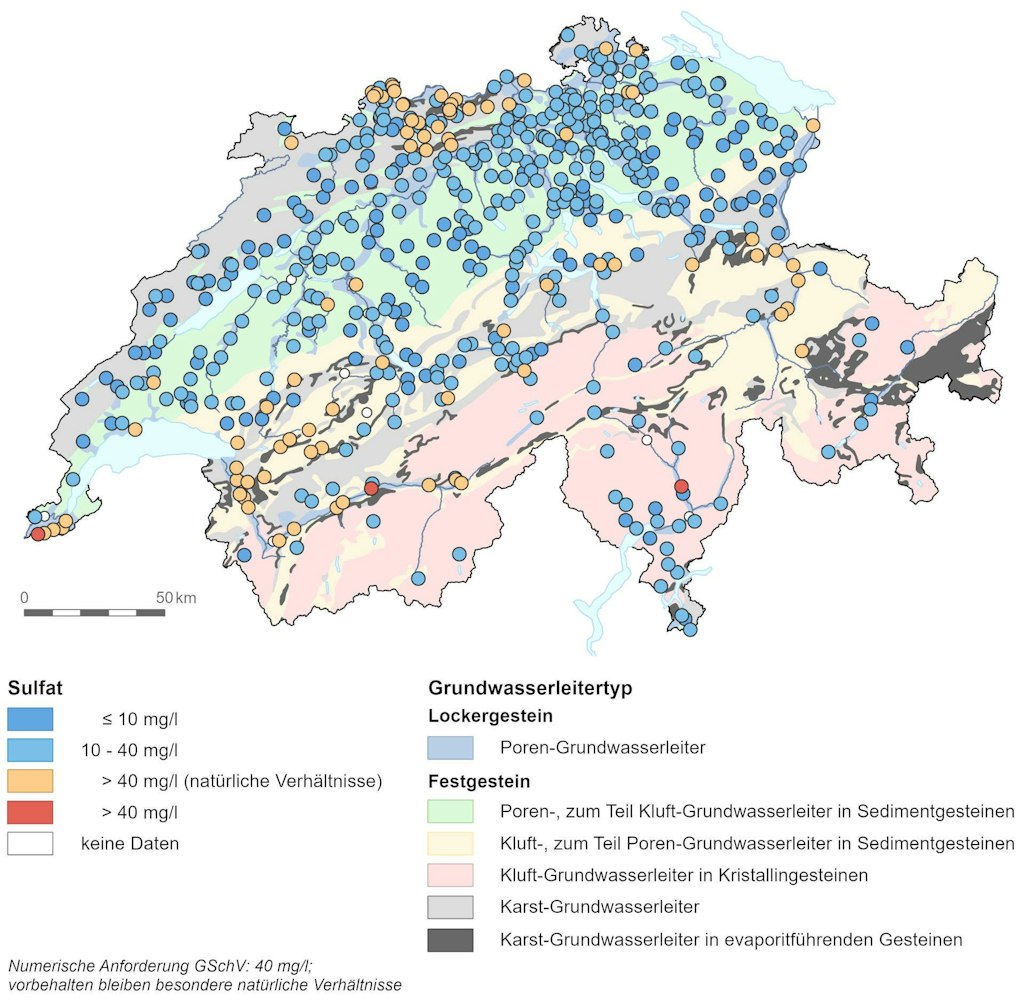Erhöhte Sulfat-Konzentrationen im Grundwasser sind überwiegend natürlichen Ursprungs. Als natürliche (geogene) Sulfat-Quellen kommen hauptsächlich die Lösung von Evaporitgestein aus Gips oder Anhydrit und - seltener - die Oxidation von Sulfidmineralen wie zum Beispiel Pyrit in Frage. So liegen die Konzentrationen in verschiedenen Karst-Grundwasserleitern des östlichen Juras und des Alpennordrandes sowie in den Poren-Grundwasserleitern im Lockergestein im oberen Rhone- und oberen Rheintal und der Region Genf aufgrund des Gesteins natürlicherweise bei über 40 mg/l. In diesen Regionen befinden sich Evaporitgesteine aus Gips oder Anhydrit.