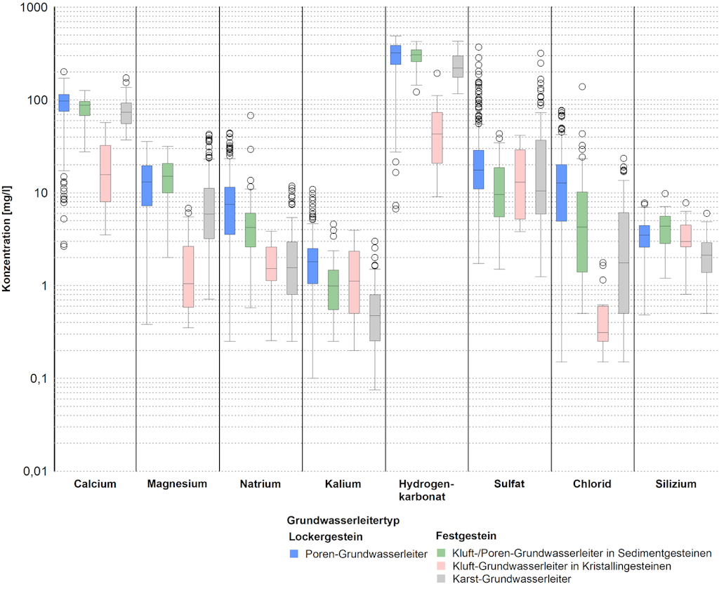 Die Konzentrationen von Calcium liegen generell zwischen 10 und 200 mg/l. Diejenigen von Magnesium, Natrium, Sulfat und Chlorid zwischen 0,1 und 100 mg/l sowie von Kalium und Silizium bei weniger als 10 mg/l.
