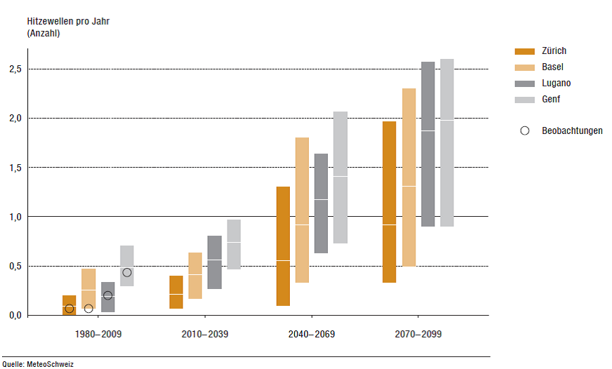 Hitzewellen mit sieben aufeinanderfolgenden Hitzetagen (Temperaturen über 30 Grad) kamen in der Periode von 1980 bis 2009 in Zürich und Basel ungefähr jedes zehnte Jahr, in Lugano ungefähr jedes fünfte Jahr und in Genf jedes zweite Jahr vor. Mit dem Klimawandel werden solche Ereignisse in Zukunft deutlich häufiger auftreten. Bereits in der Periode zwischen 2010 und 2039 werden Hitzeperioden in den genannten Städten bis zu dreimal häufiger vorkommen. Mitte des Jahrhunderts dürften diese in Lugano, Basel und Genf im Mittel sogar jedes Jahr auftreten, in Zürich ungefähr jedes zweite.