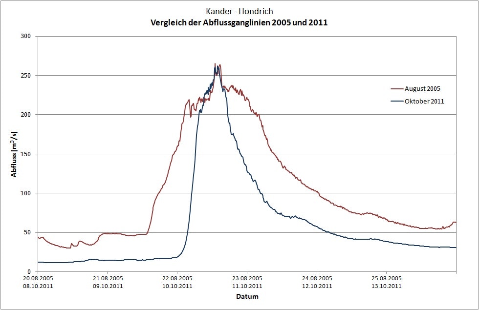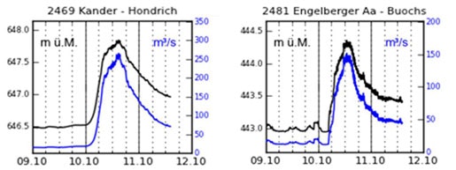 Die Pegel der Kander und Lütschine im Berner Oberland stiegen innerhalb von wenigen Stunden fast auf dasselbe Niveau an wie im August 2005. An der Kander bei Hondrich wurde am Montagmittag eine Abflussspitze von 265 m3/s gemessen, was einem über 100-jährlichen Ereignis (HQ100) entspricht (Jährlichkeit >100). Ein HQ100 ist eine Abflussmenge, die statistisch im Durchschnitt einmal in 100 Jahren erreicht oder überschritten wird. Diese Abflussspitze von 265 m3/s entspricht einem neuen Oktober-Höchstwert seit Messbeginn 1981. Der bisher höchste gemessene Abflusswert von 273 m3/s wurde jedoch am 22. August 2005 registriert. Im Vergleich zum damaligen Hochwasser trat aber die Abflussspitze bei diesem Ereignis in wesentlich kürzerer Zeit auf.