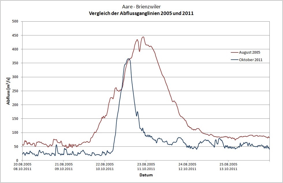 11.10.2011 - Hydrologischer Spezialbericht des Bundesamtes für Umwelt BAFU Im Berner Oberland, in der Zentralschweiz und im Wallis sind am Montag, 10. Oktober 2011 zahlreiche Flüsse über die Ufer getreten. An verschiedenen Messstationen des Bundesamtes für Umwelt wurden für den Oktober neue Höchstwerte registriert. Die Bilder der hohen Abflussmengen erinnern an das Hochwasser im August 2005. Mehrere Eisenbahnlinien und Strassen sind unterbrochen worden und weitere Schäden sind aufgetreten. Hinweis: Alle erwähnten Messdaten sind provisorisch.