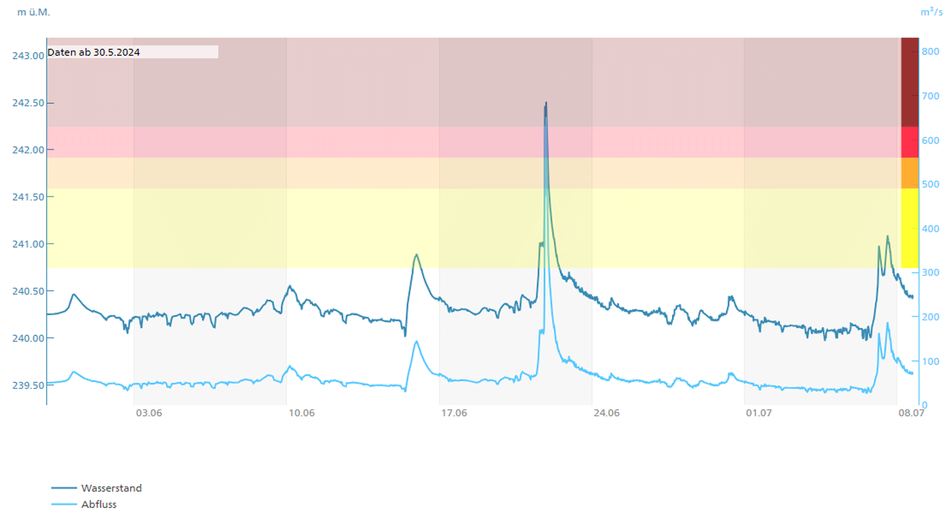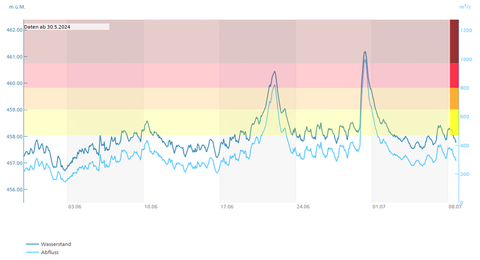 Hochwasser-Messwerte der Ereignisse im Sommer 2024 und Vergleich mit den Gefahrenstufen
