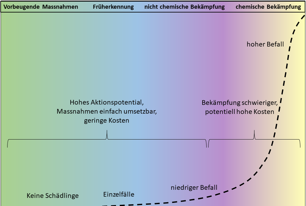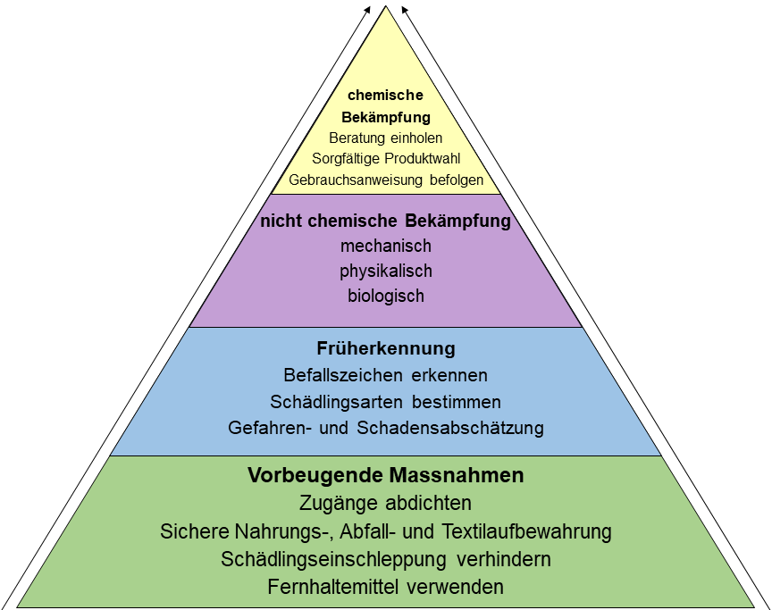 - Vorbeuge-, Früherkennungs- und Bekämpfungsmassnahmen sind je nach Schädlingsart unterschiedlich.
