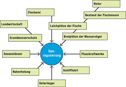 So wäre für Fauna und Flora insbesondere im Frühjahr ein natürliches, unreguliertes Pegelregime günstig, aber manche Seen müssen in dieser Jahreszeit tief gehalten werden, um Schneeschmelzwasser auffangen zu können. Im Winter ist die Schifffahrt auf genügend hohe Seestände angewiesen, während die Pflege seenaher Riedflächen im Herbst und Winter tiefe Wasserstände erfordert. Dagegen sind sowohl für die Landwirtschaft als auch für die unterliegenden Wasserkraftwerke eher ausgeglichene, konstante Verhältnisse von Vorteil. Und im Hochwasserfall wird in Seenähe erwartet, dass möglichst viel Wasser aus dem See abgelassen wird, wodurch aber im Unterlauf die Hochwassergefahr zunehmen kann.