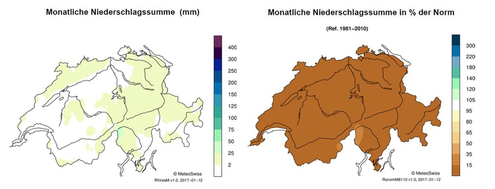 Bereits der Herbst 2016 war trocken und es folgte ein aussergewöhnlich trockener Dezember. Gemäss Informationen von MeteoSchweiz war es in vielen Gebieten der Schweiz der niederschlagsärmste Dezember seit Messbeginn 1864. Im westlichen Mittelland und im Wallis fiel gebietsweise gar kein Niederschlag. Andernorts fielen – mit ein paar Ausnahmen – weniger als zehn Prozent der normalen