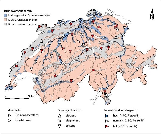 Aufgrund der unterdurchschnittlichen Niederschlagsmengen in der zweiten Jahreshälfte 2016 waren die Grundwasserstände und Quellabflüsse in der ganzen Schweiz stetig gesunken. Sie waren im Januar generell tief und wiesen eine weiter sinkende Tendenz auf.