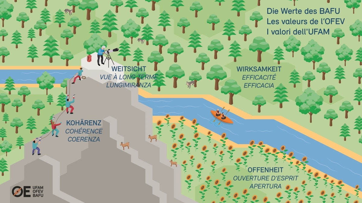 Die Werte des BAFU: Kohärenz, Weitsicht, Wirksamkeit und Offenheit – sie bilden das Fundament einer Gemeinschaft, in der Vertrauen wächst, Ideen zählen und wir die Umweltthemen vorwärts bringen.