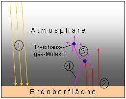 Sonnenstrahlung wird von der Erdoberfläche aufgenommen. Die Erdoberfläche gibt ihrerseits Wärmestrahlung an die Atmosphäre ab. Treibhausgase in der Atmosphäre nehmen diese Strahlung auf und schicken einen Teil davon wieder zur Erde zurück. Aufgrund dieser Rückstrahlung erwärmen sich die Erdoberfläche und die unterste Atmosphärenschicht. Je höher die Konzentration der Treibhausgase, desto grösser ist diese zusätzliche Erwärmung.