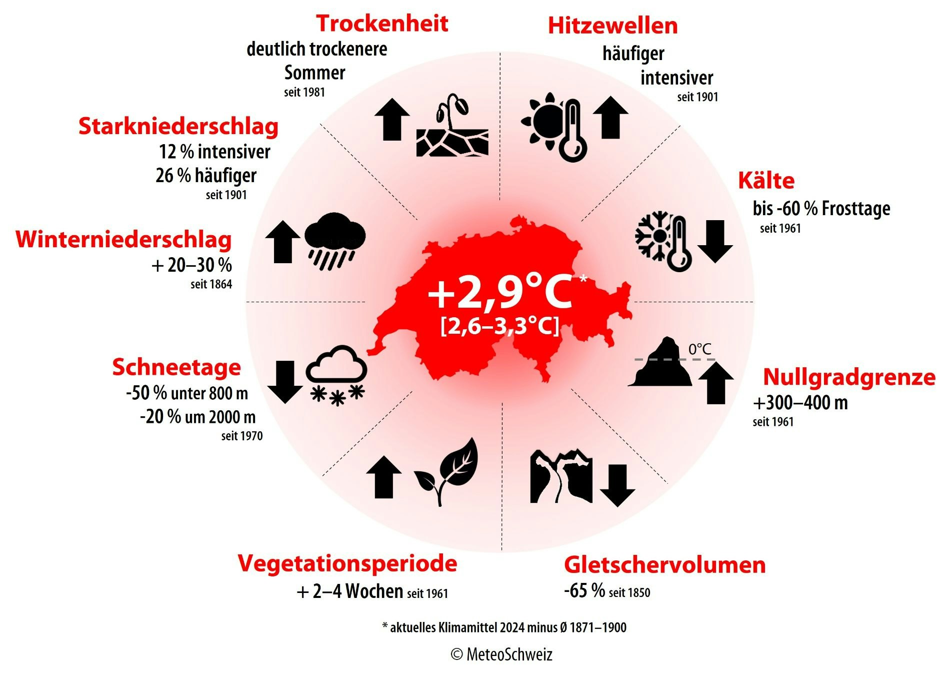 Die Klimaerwärmung hat auch in der Schweiz immer stärker spürbare Auswirkungen. Es besteht deshalb dringender Handlungsbedarf. Die steigenden Temperaturen und die Häufung von Extremereignissen machen Massnahmen zum Schutz vor Hitze, Sommertrockenheit, Starkniederschlag, Felsstürzen, Rutschungen und Murgängen notwendig. Ökosysteme wie der Wald sowie gefährdete Lebensräume müssen auf die veränderten klimatischen Verhältnisse vorbereitet werden. Dies umso mehr, als die globalen Treibhausgasemissionen weiter steigen und die Auswirkungen des Klimawandels sich in den kommenden Jahrzehnten noch verstärken werden.