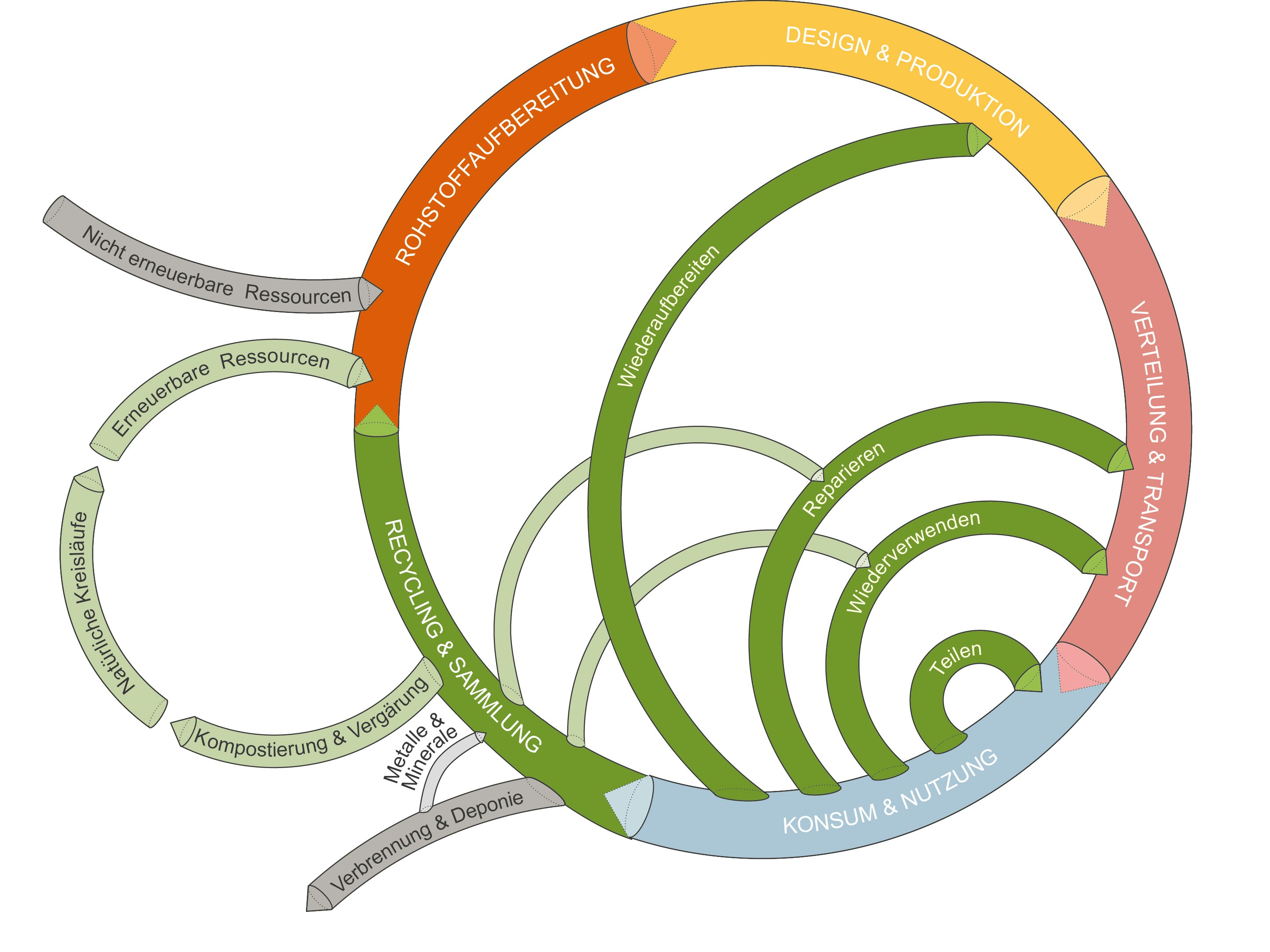 Kreislaufwirtschaft ist ein ganzheitlicher Ansatz, der den gesamten Kreislauf betrachtet: Von der Rohstoffgewinnung, über das Design, die Produktion und die Distribution eines Produkts bis zu seiner möglichst langen Nutzungsphase und zum Recycling. Damit Produkte und Materialien in diesem Kreislauf verbleiben, braucht es ein Umdenken aller Akteure.