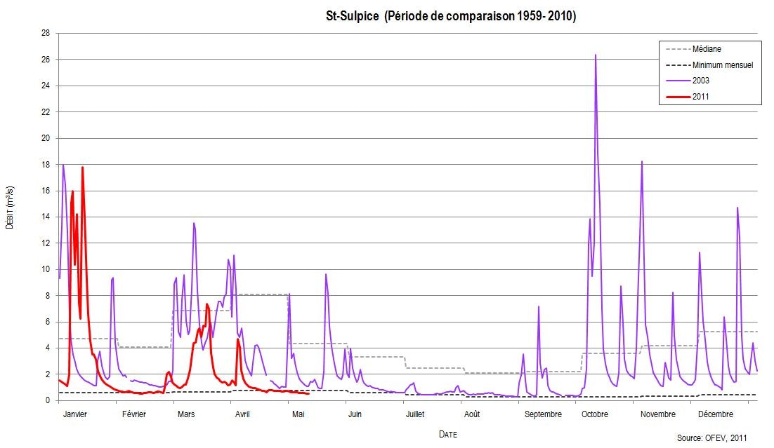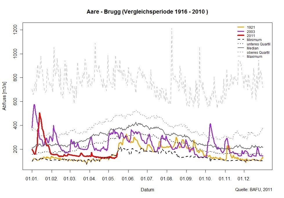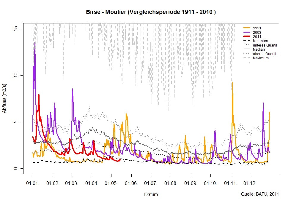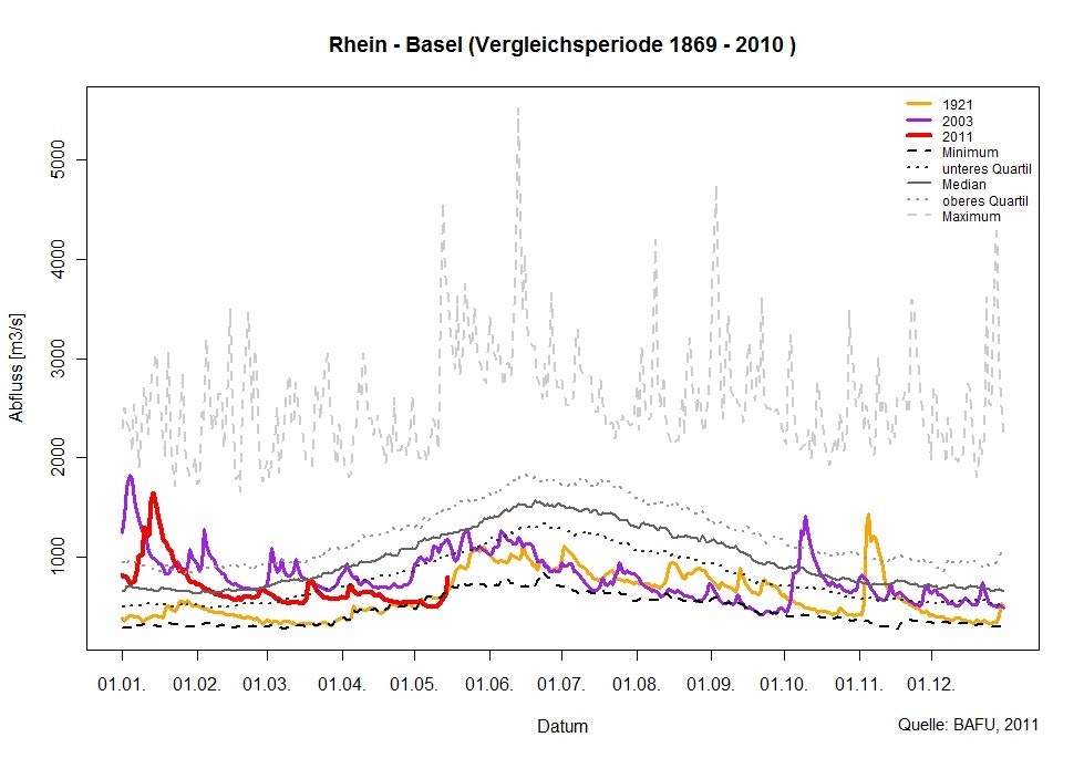 Die Niederschläge des Wochenendes vom 14. und 15. Mai 2011 vermochten kurzfristig die Niedrigwassersituation etwas zu entspannen, jedoch reichten die Mengen nicht aus, um das im Vergleich zum langjährigen Mittel beträchtliche Niederschlagsdefizit seit Jahresbeginn auszugleichen. Besonders im Jura und im Mittelland sind die Abflüsse und Seewasserstände sehr tief. Auch in den nächsten Tagen werden gemäss den Abflussprognosen des BAFU die Wasserstände in diesen Regionen auf tiefem Niveau bleiben.