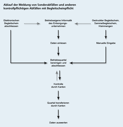 Die Daten über die entgegengenommenen Sonderabfälle und anderen kontrollpflichtigen Abfälle mit Begleitscheinpflicht können entweder manuell erfasst oder über eine Schnittstelle eingelesen werden. Werden elektronische Begleitscheine verwendet, kann die Meldung direkt aus den Angaben im Begleitschein erzeugt werden. Die Daten werden von den zuständigen kantonalen Fachstellen geprüft.