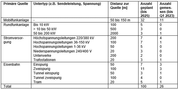 Bis Ende 2022 wurden Routenmessungen in 225 (von 300 insgesamt geplanten) typischen Aussenbereichen in der Schweiz Messungen zur Belastung der Bevölkerung durch NIS durchgeführt. Weiterhin wurden 158 Messungen in öffentlichen Bereichen (z.B. Restaurant, Bahnhof, Supermarkt) und in 246 Messungen öffentlichen Verkehrsmitteln (z.B. Bus, Zug, Tram) absolviert. In Abbildung 3 sind die für NIS-Messungen selektierten typischen Aussenbereiche und öffentlichen Bereiche auf einer Übersichtskarte dargestellt. In Privatwohnungen konnten bis März 2023 bisher 26 (der insgesamt 100 geplanten) Messungen absolviert werden (siehe Tabelle 1). Die Messungen in Privatwohnungen sind aufgrund der Corona-Pandemie noch etwas in Verzug. Seit Januar 2023 werden zudem fünf festinstallierte Messtation betrieben, an denen die Belastung seitdem dauerhaft gemessen wird.
