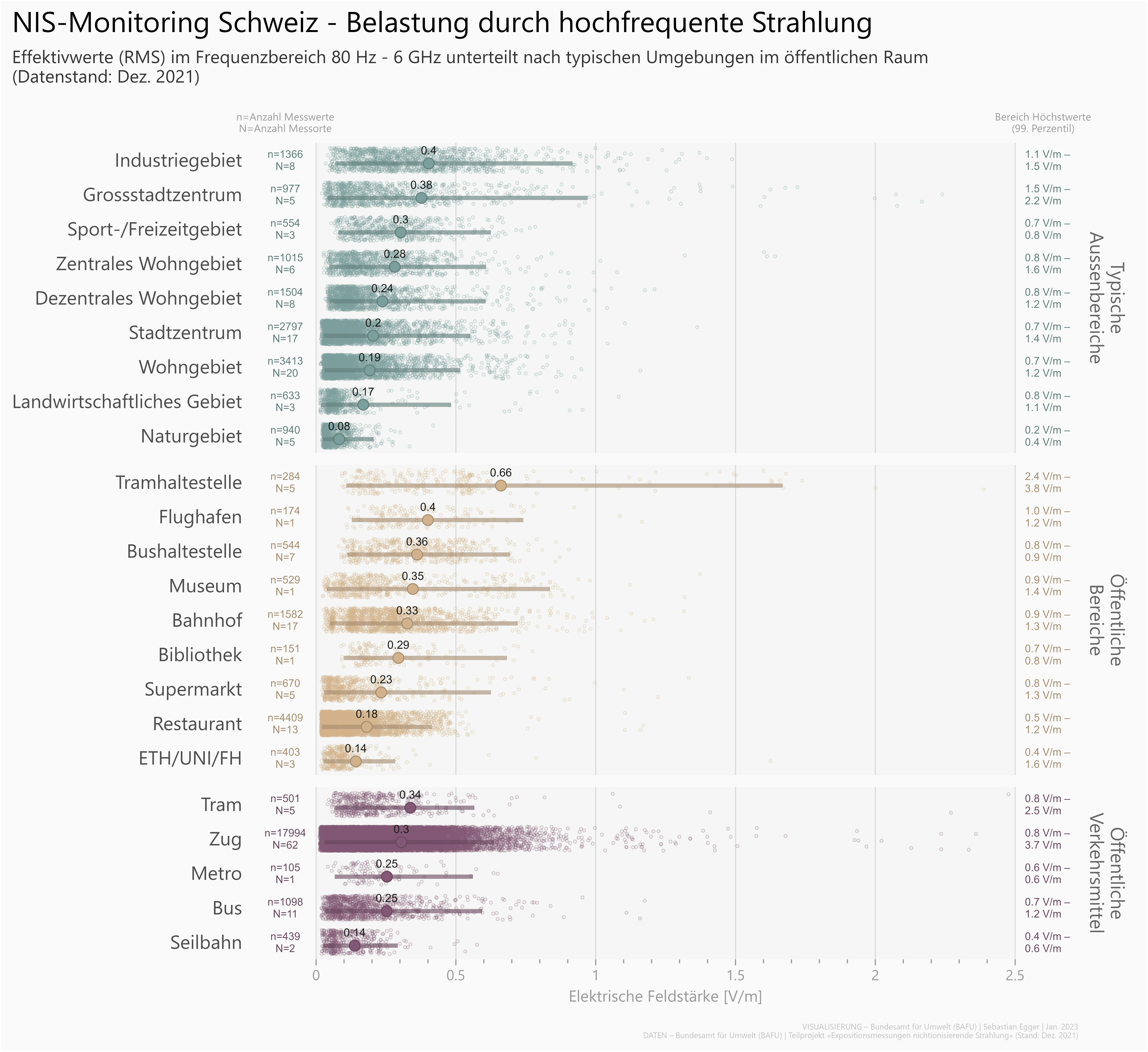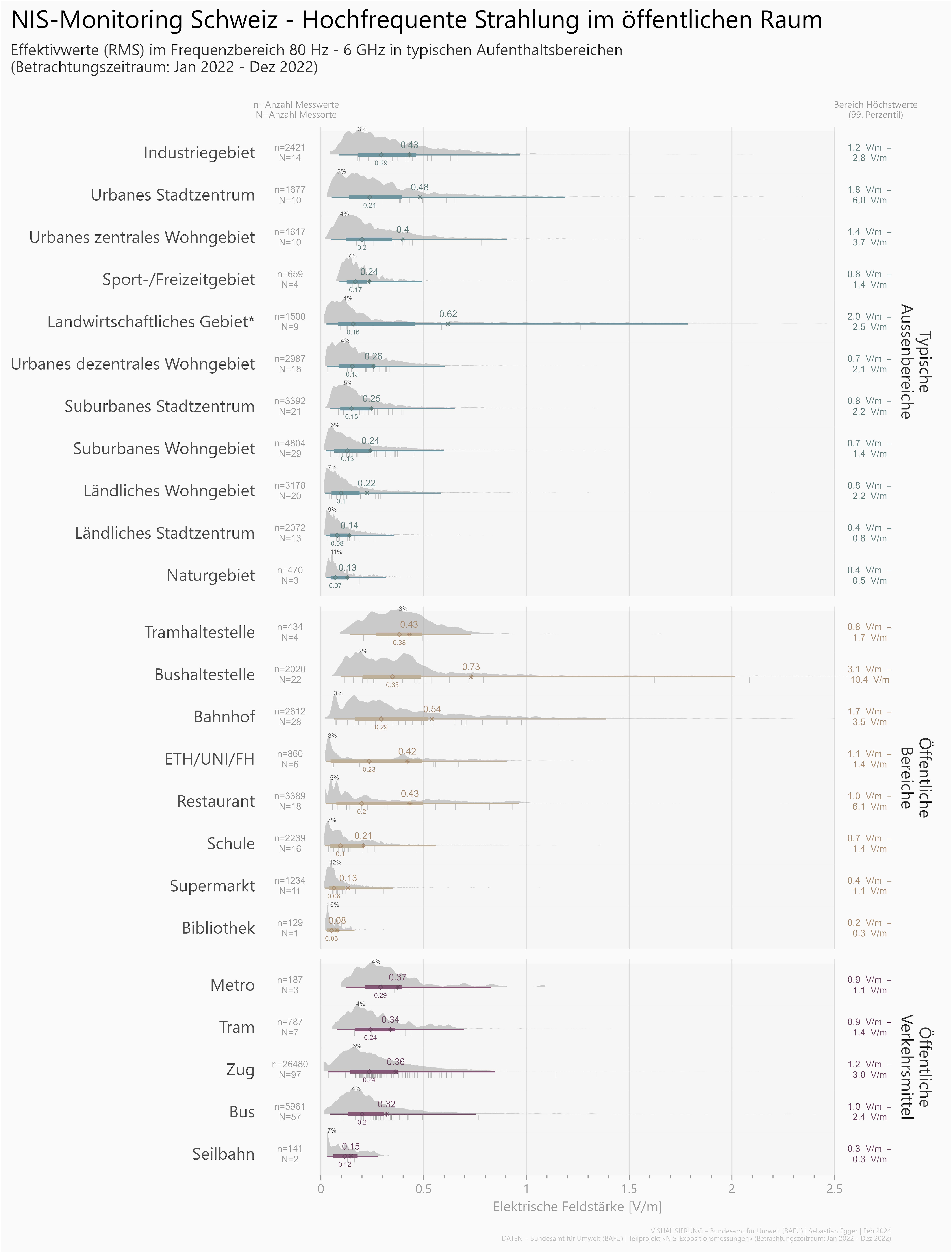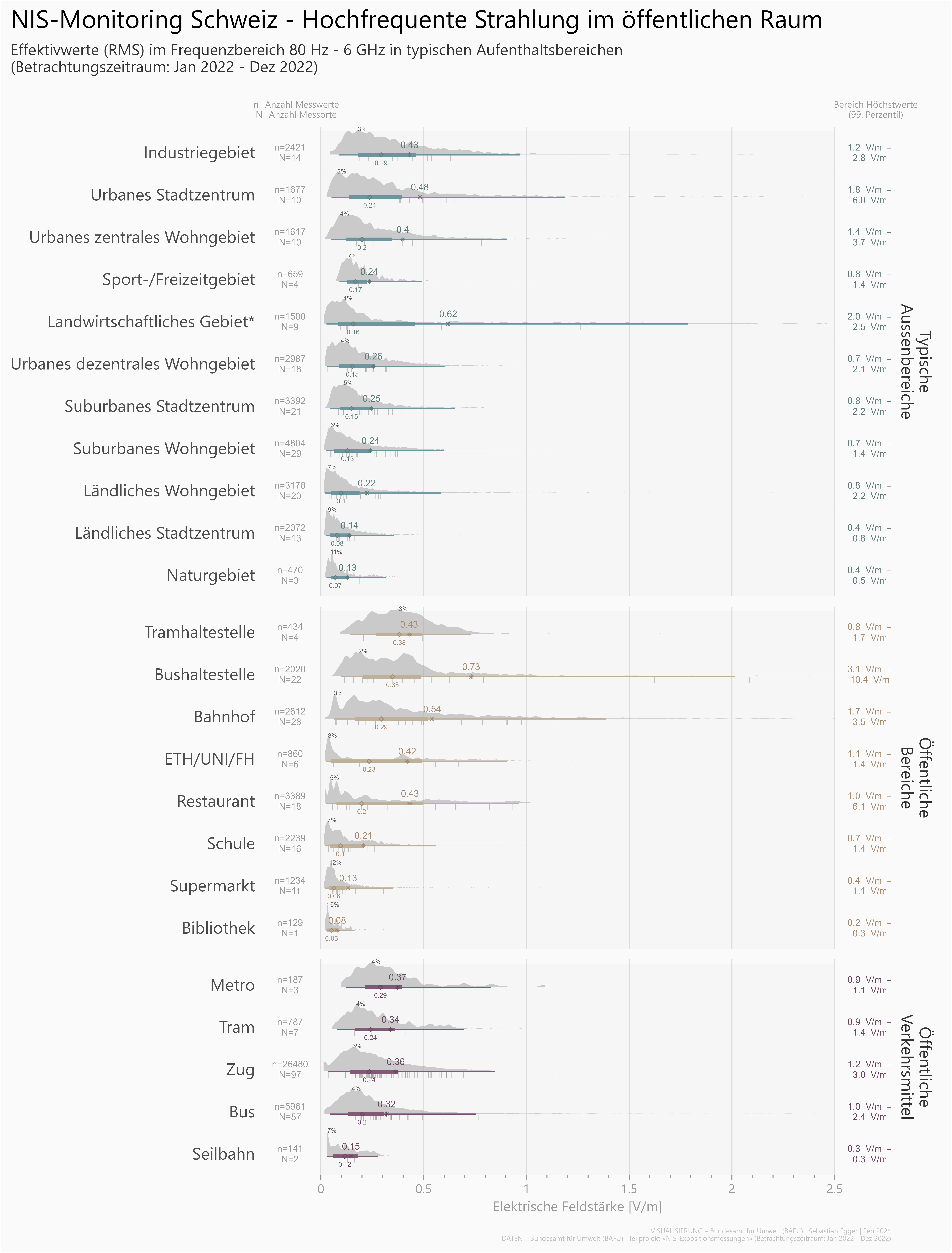 Die im Jahr 2022 gemessene Belastung durch hochfrequente Strahlung liegt in öffentlich zugänglichen Bereichen, d.h. dort wo sich Menschen üblicherweise im Alltag aufhalten, im Mittel (RMS) zwischen 0.13 V/m und 0.73 V/m und damit auf einem ähnlich tiefen Niveau wie im Vorjahr. Die höchsten mittleren Belastungen – auf diesem tiefen Niveau – wurden an Bushaltestellen (0.73 V/m), an Bahnhöfen (0.54 V/m), in urbanen Stadtzentren (0.48 V/m), an Tramhaltestellen (0.43 V/m) und in Industriegebieten (0.43 V/m) gemessen. Die tiefsten mittleren Belastungen wurden in Naturgebieten (0.13 V/m) und ländlich geprägten Gebieten (0.14 bis 0.22 V/m) sowie in Supermärkten (0.13 V/m), Schulen (0.21 V/m) und in einer Bibliothek (0.08 V/m) registriert (vgl. Abbildung 8). Alle aufgezeichneten ca. 270’000 Messwerte befinden sich deutlich – bzw. grösstenteils sehr deutlich – unterhalb der Immissionsgrenzwerte..jpg?w=6840&auto=format)