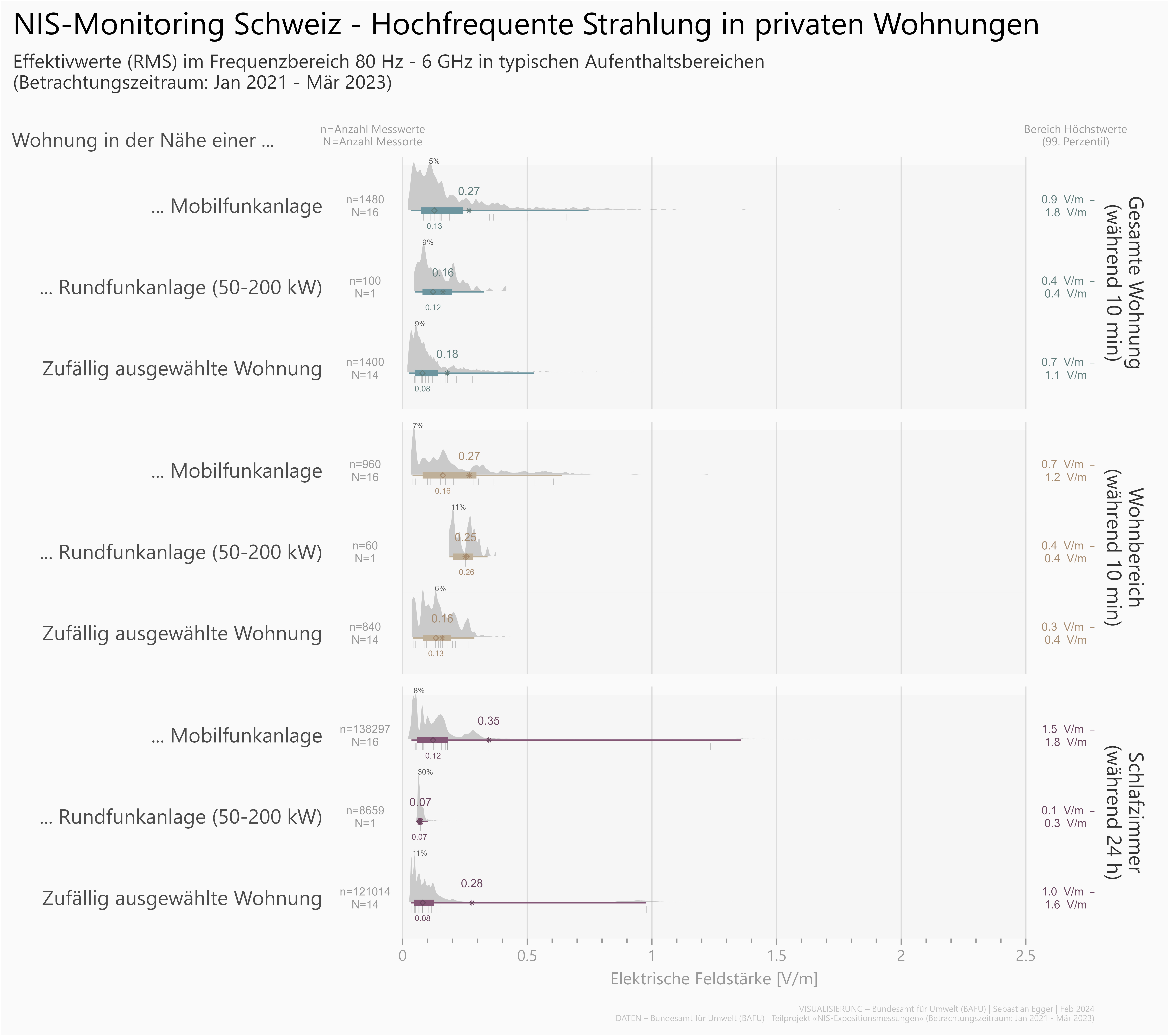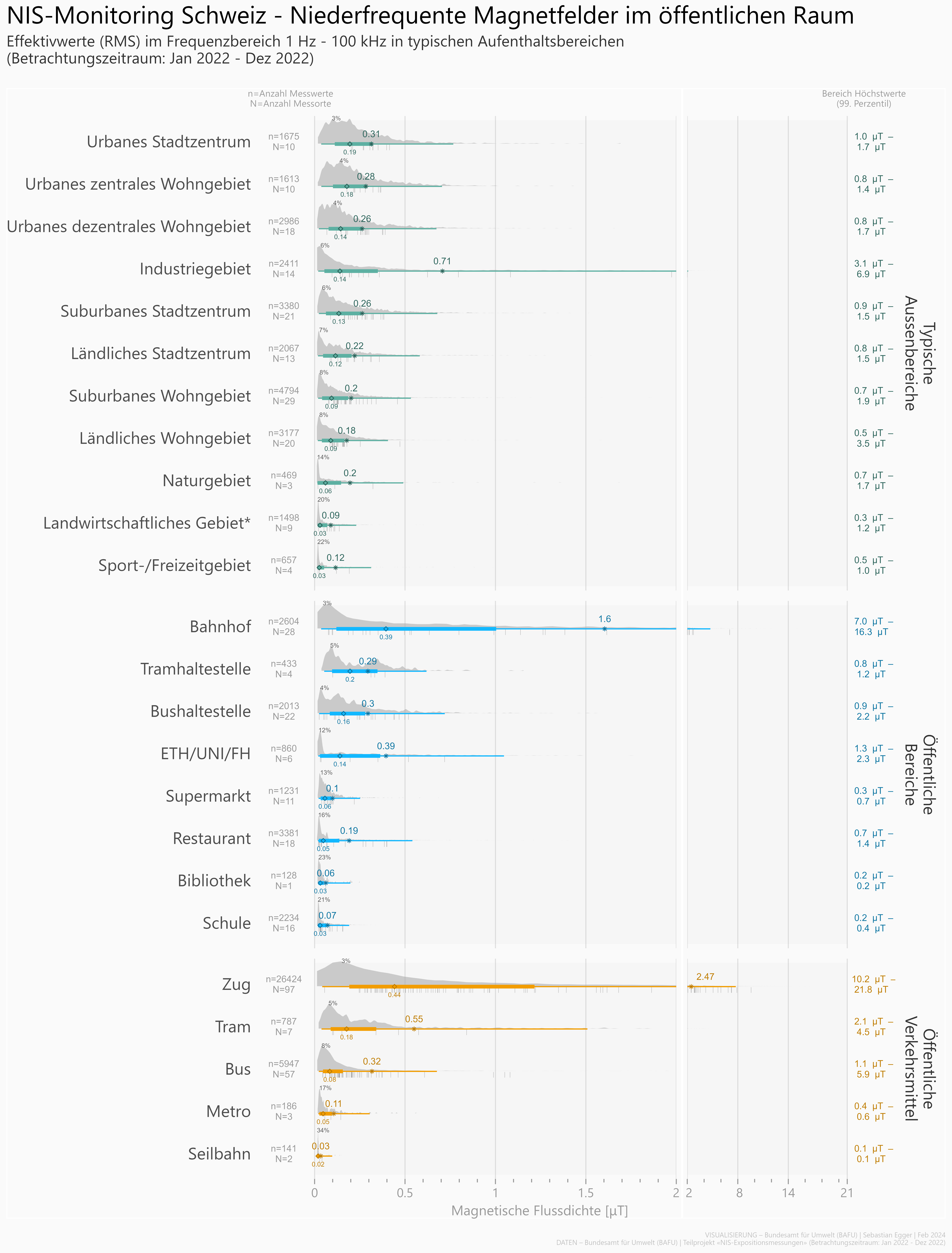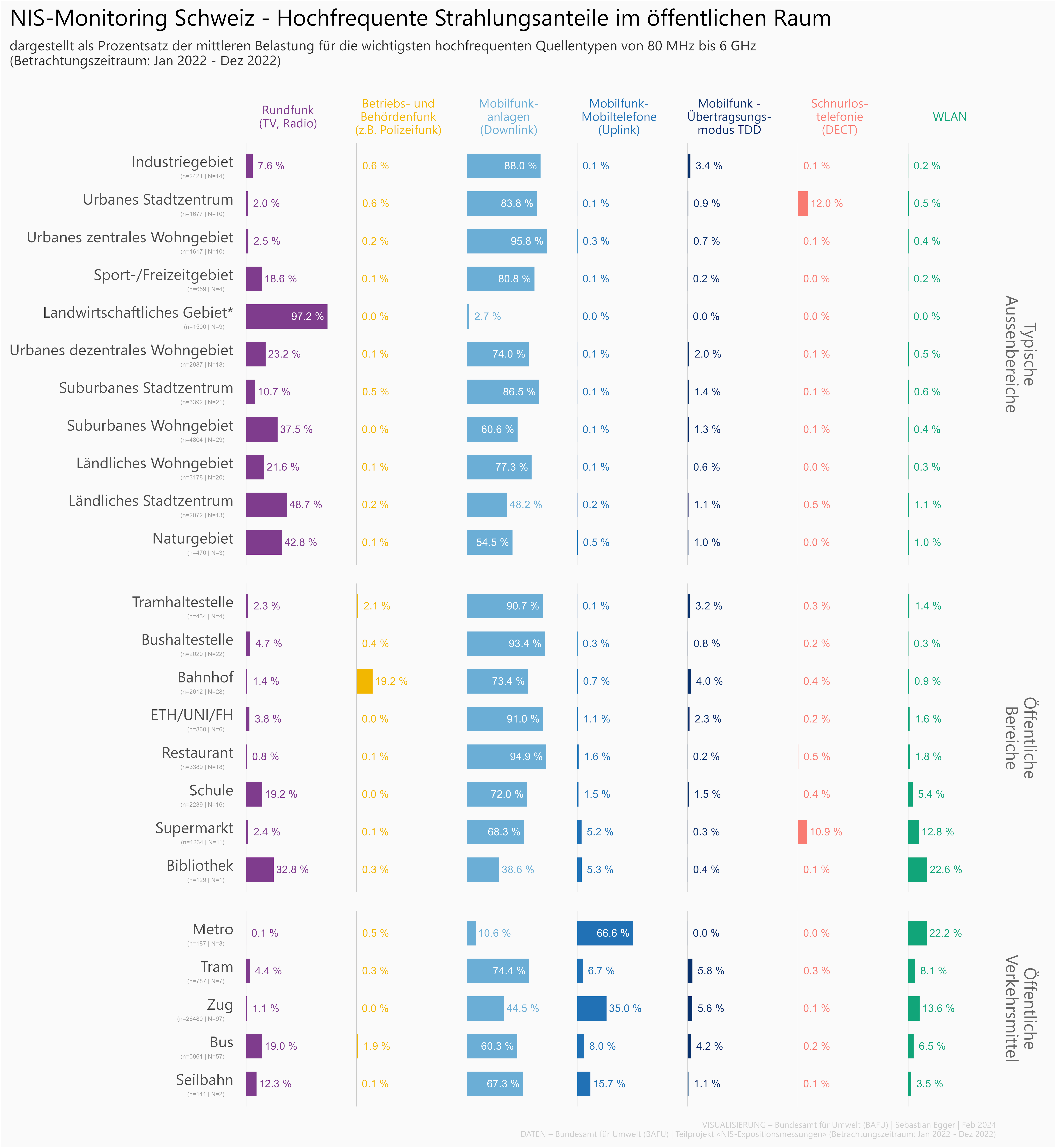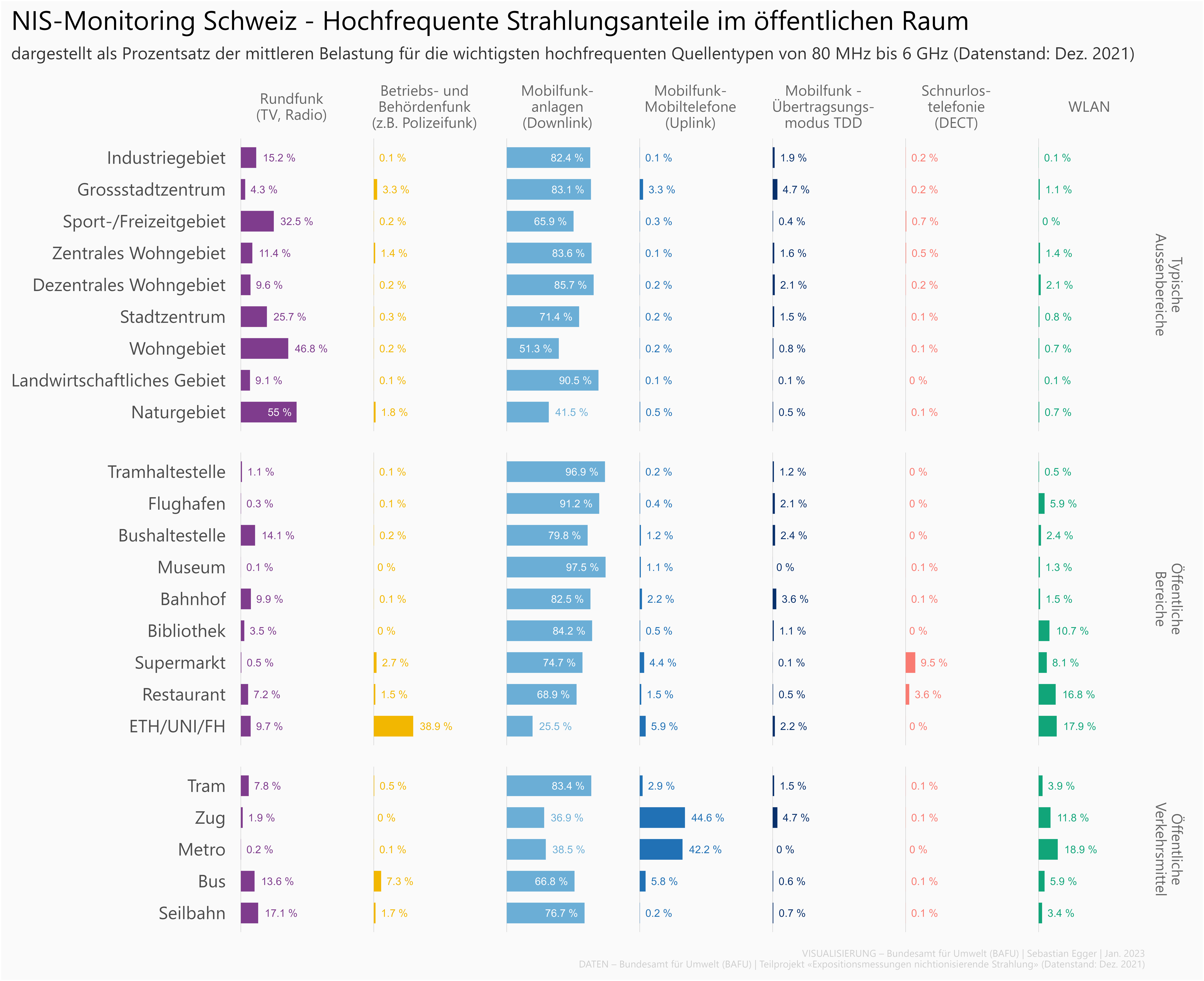 Die im Jahr 2022 gemessene Belastung durch hochfrequente Strahlung liegt in öffentlich zugänglichen Bereichen, d.h. dort wo sich Menschen üblicherweise im Alltag aufhalten, im Mittel (RMS) zwischen 0.13 V/m und 0.73 V/m und damit auf einem ähnlich tiefen Niveau wie im Vorjahr. Die höchsten mittleren Belastungen – auf diesem tiefen Niveau – wurden an Bushaltestellen (0.73 V/m), an Bahnhöfen (0.54 V/m), in urbanen Stadtzentren (0.48 V/m), an Tramhaltestellen (0.43 V/m) und in Industriegebieten (0.43 V/m) gemessen. Die tiefsten mittleren Belastungen wurden in Naturgebieten (0.13 V/m) und ländlich geprägten Gebieten (0.14 bis 0.22 V/m) sowie in Supermärkten (0.13 V/m), Schulen (0.21 V/m) und in einer Bibliothek (0.08 V/m) registriert (vgl. Abbildung 8). Alle aufgezeichneten ca. 270’000 Messwerte befinden sich deutlich – bzw. grösstenteils sehr deutlich – unterhalb der Immissionsgrenzwerte..jpg?w=6840&auto=format)