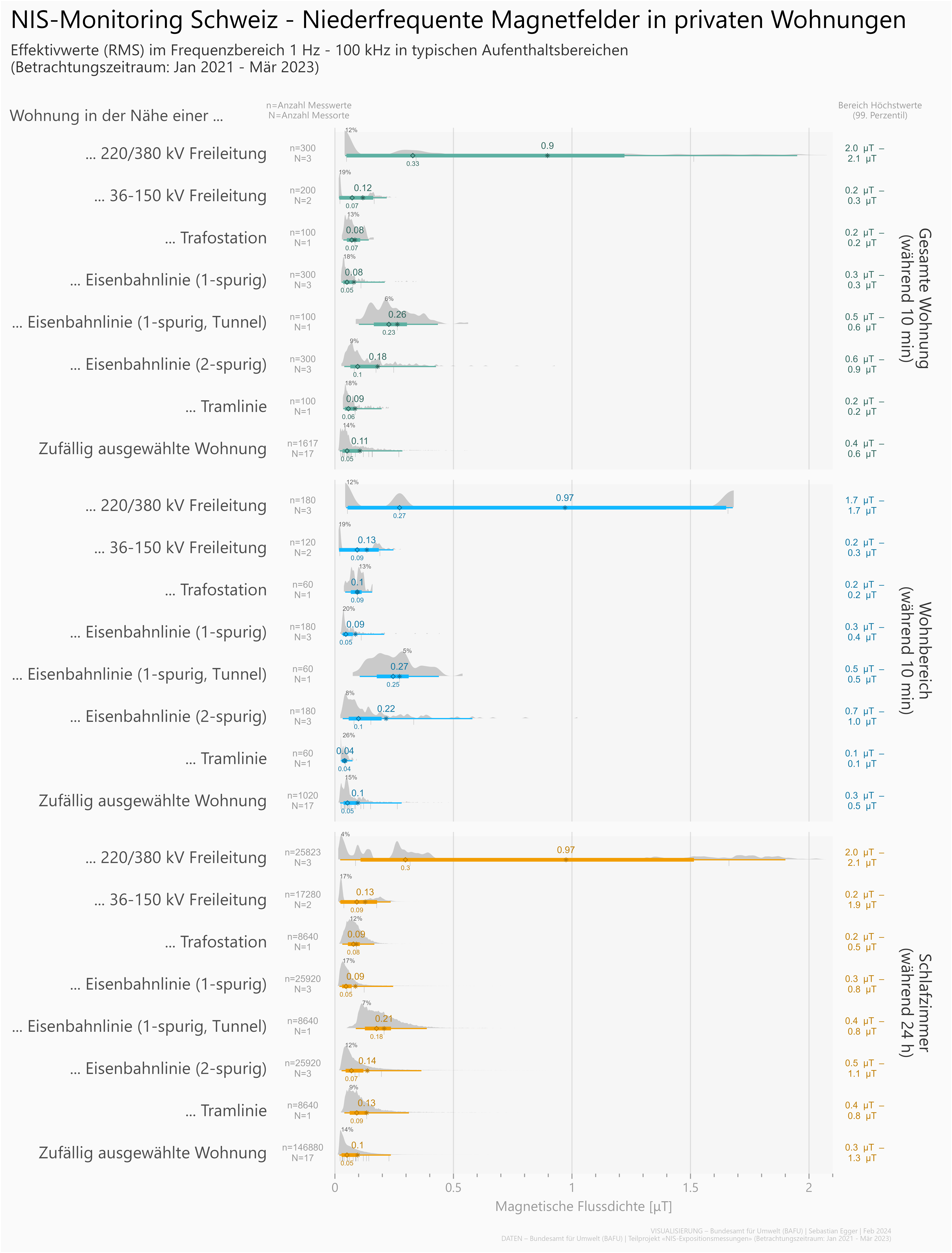 Abbildung 15: Niederfrequente Magnetfeldanteile in privaten Wohnungen Die Messungen an öffentlich zugänglichen Orten und in Privatwohnungen werden noch mindestens bis Ende 2025 fortgeführt. Ende 2025 werden zwei vollständige Erhebungen zur NIS-Belastung an öffentlich zugänglichen Orten in allen Schweizer Landesteilen (d.h. zwei gesamtschweizerische Datensätze) sowie 100 Messungen in Privatwohnungen absolviert sein.