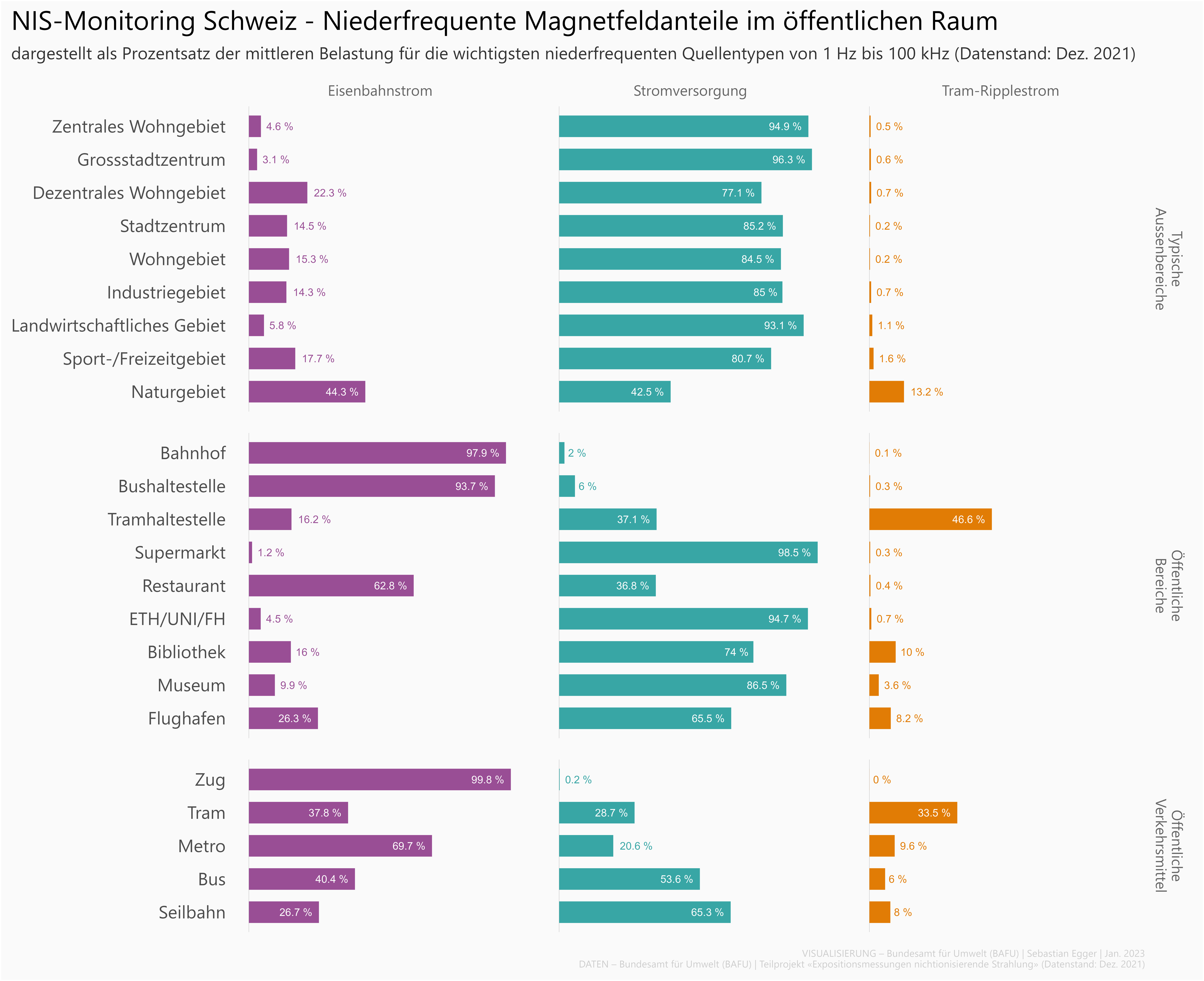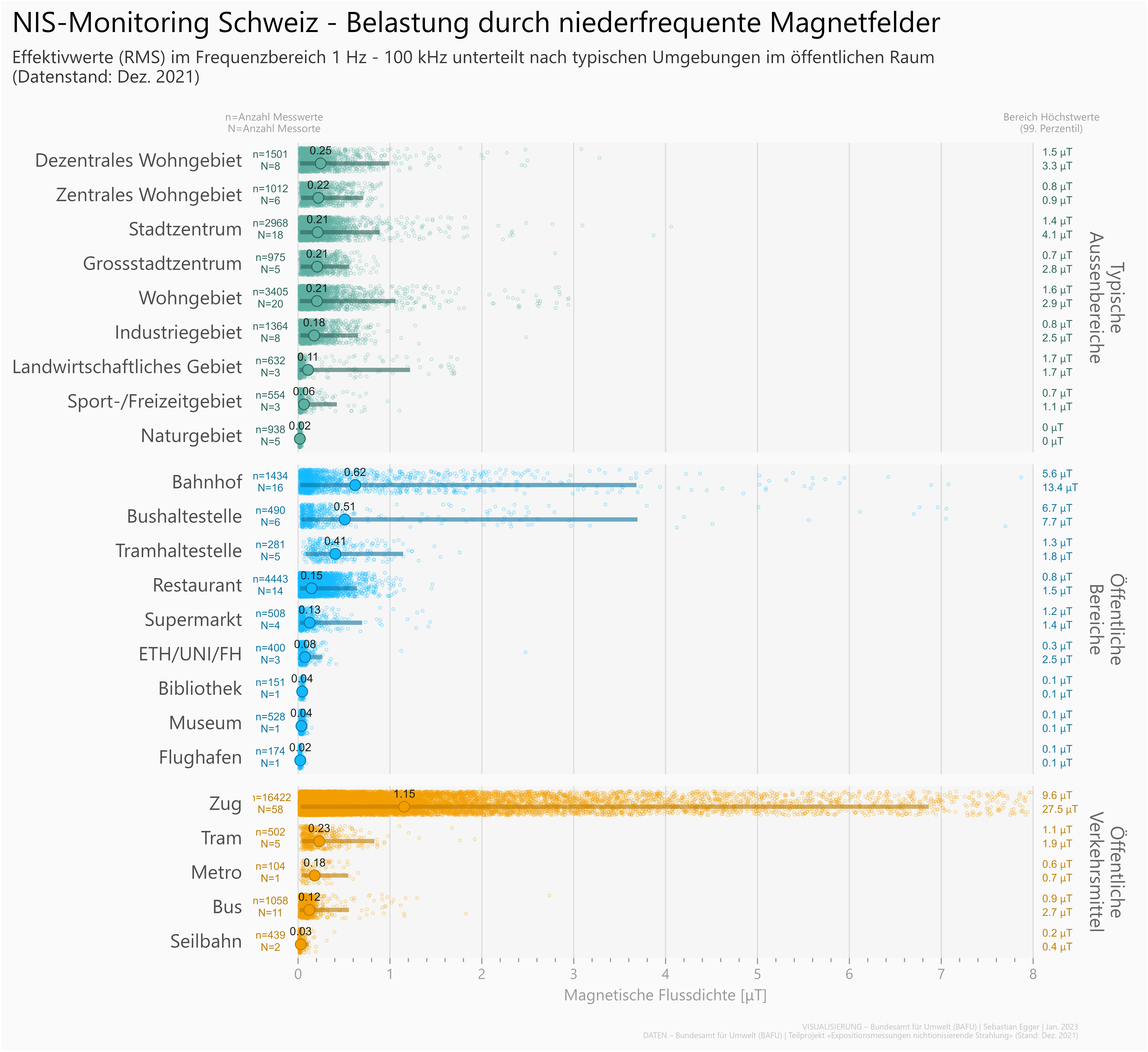 Die Belastung durch niederfrequente Magnetfelder in öffentlich zugänglichen Bereichen liegt im Mittel zwischen 0.02 und 1.15 µT. Die höchsten mittleren Belastungen – auf tiefem Niveau – traten dabei in Zügen (1.15 µT), an Bahnhöfen (0.62 µT) und an Busshaltestellen (0.51 µT) auf (vgl. Abbildung 5)..jpg?w=7200&auto=format)
